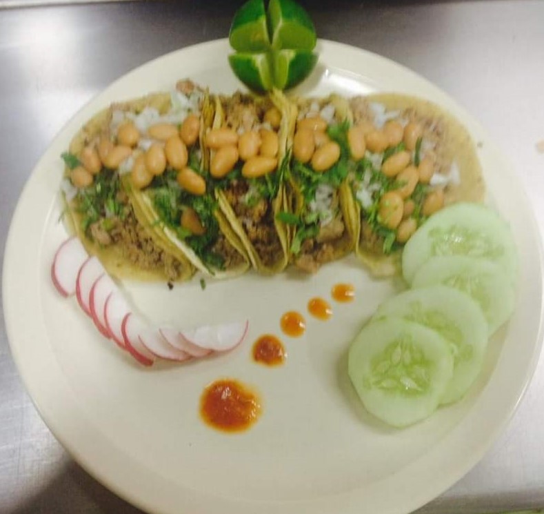 Tacos al pastor preparado con carne, tortilla de maíz taquera, cebolla, cilantro y frijoles + salsa chile (Porcion personal)