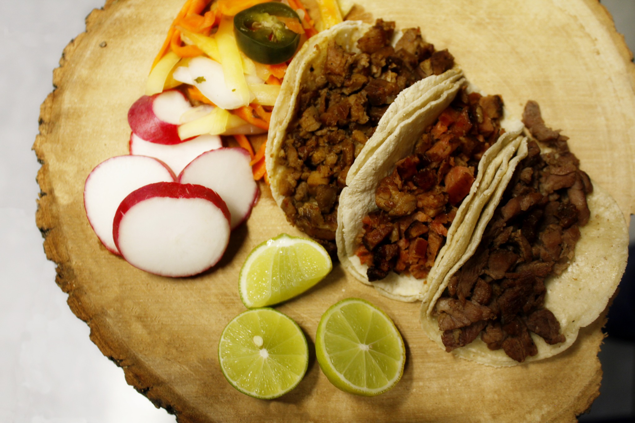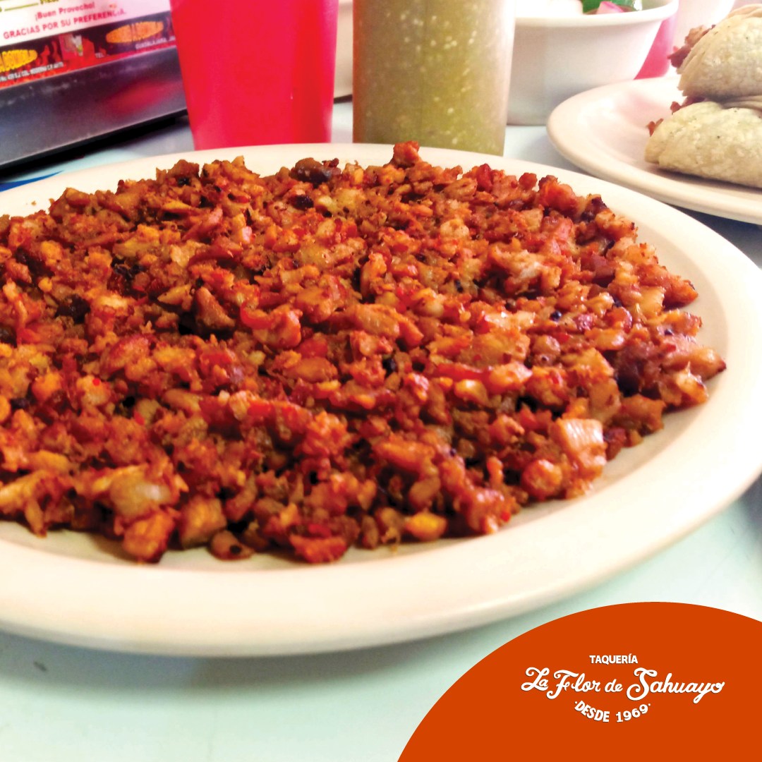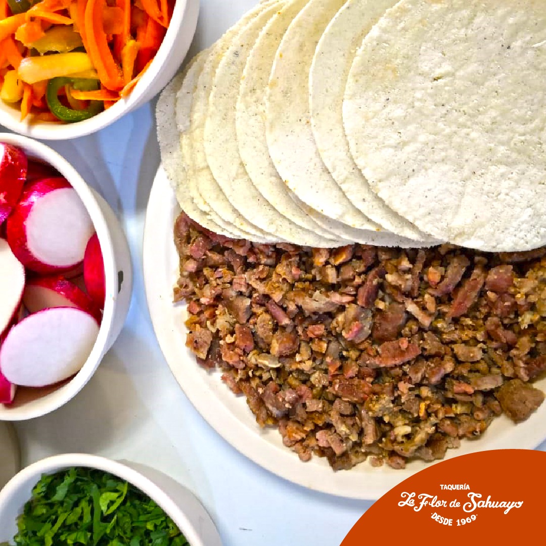 250 gr. Incluye tortillas y guarniciones de cebolla, cilantro, rabanos, limones, fruta en vinagre, salsa roja y verde.