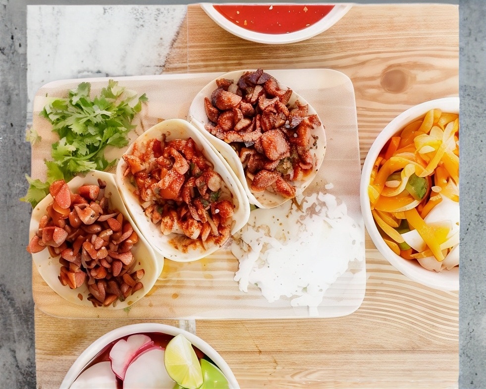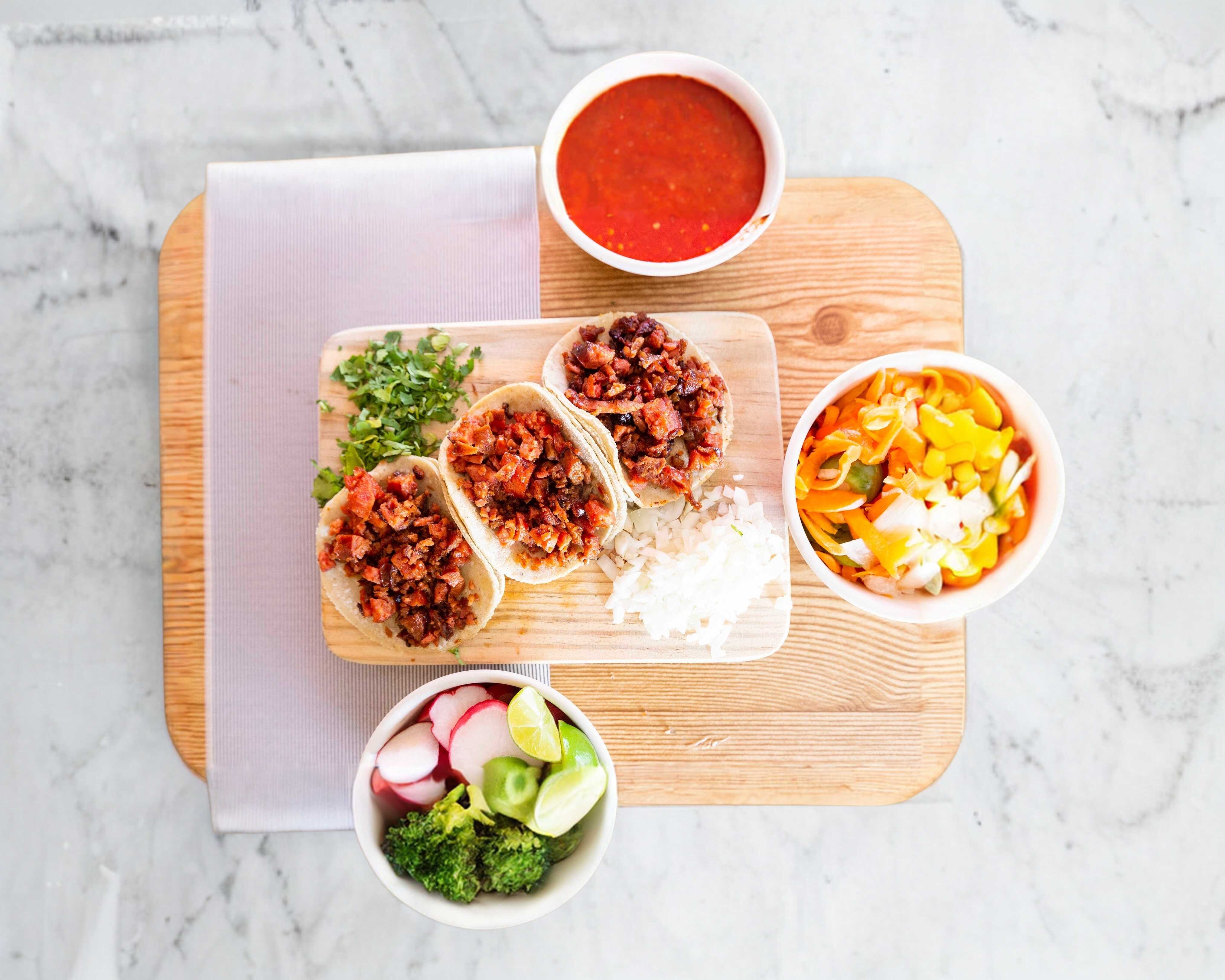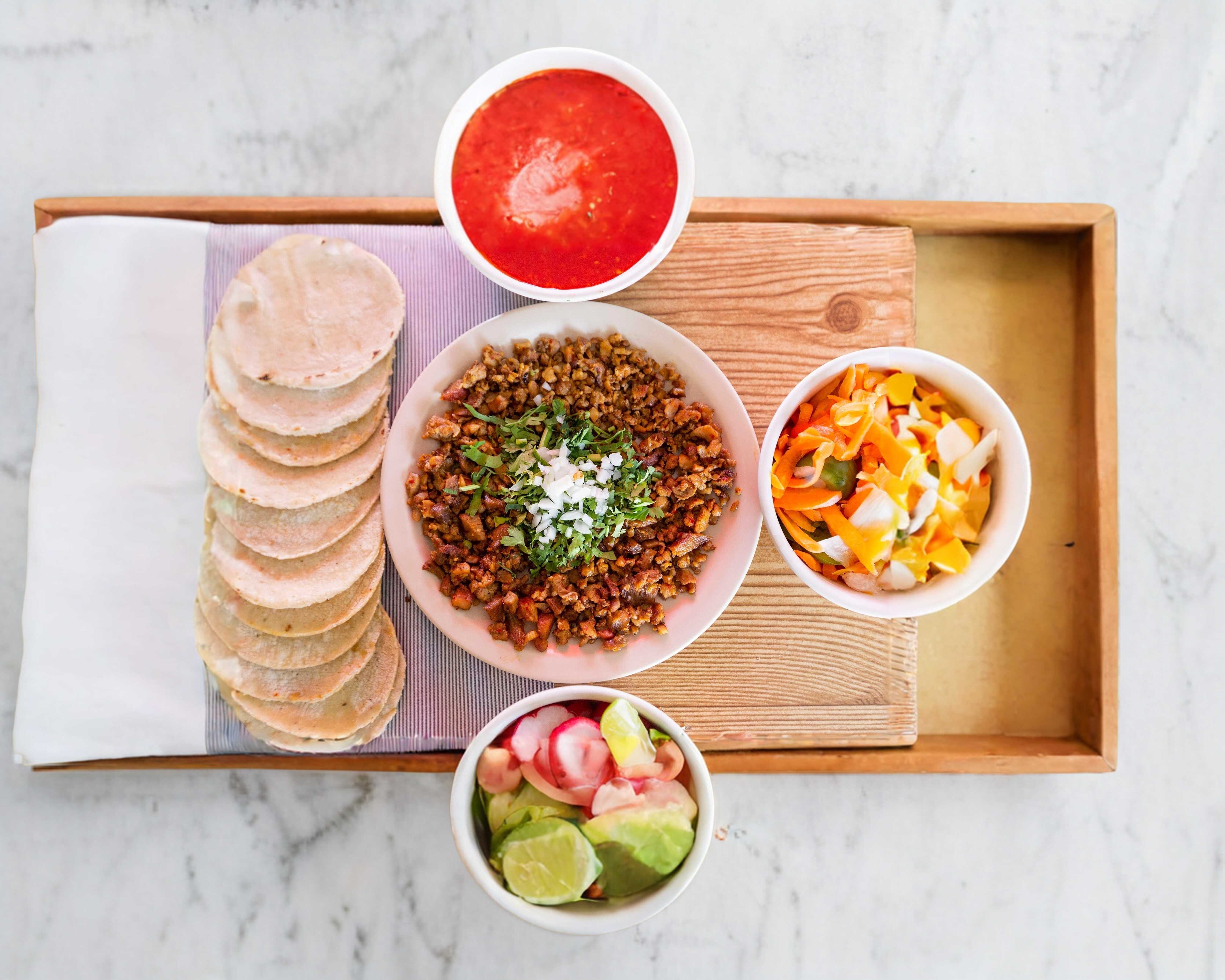 130 gr. Incluye tortillas para 7 tacos y guarniciones de cebolla, cilantro, rabanos, limones, fruta en vinagre, salsa roja y verde.