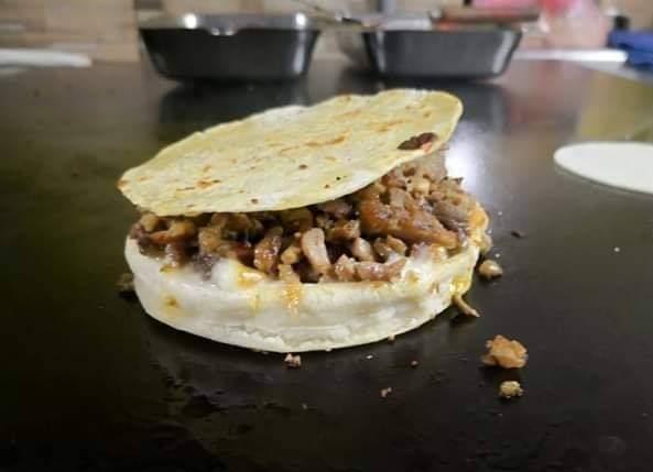 Gordita de masa con queso, carne y una tortilla de tapa.