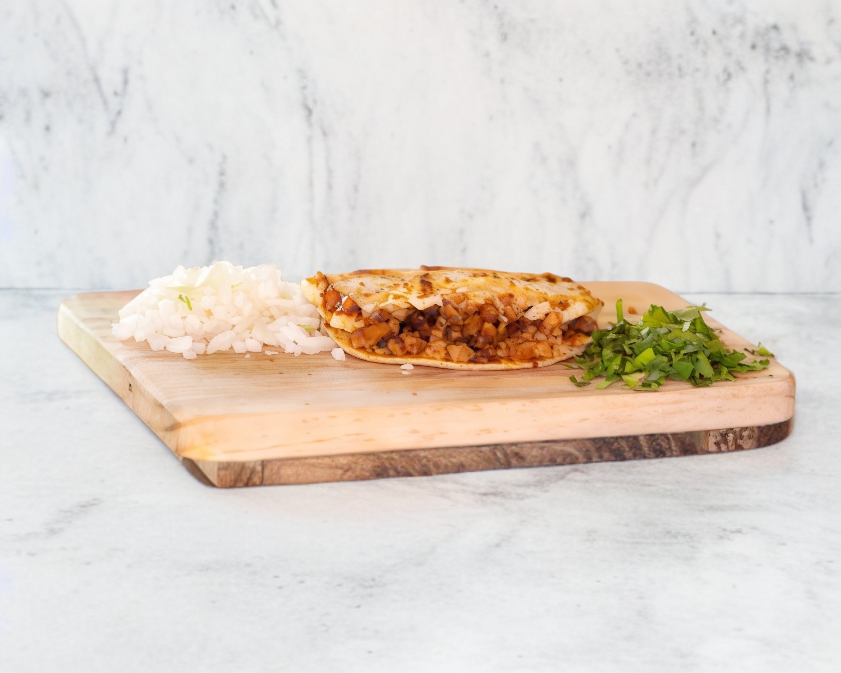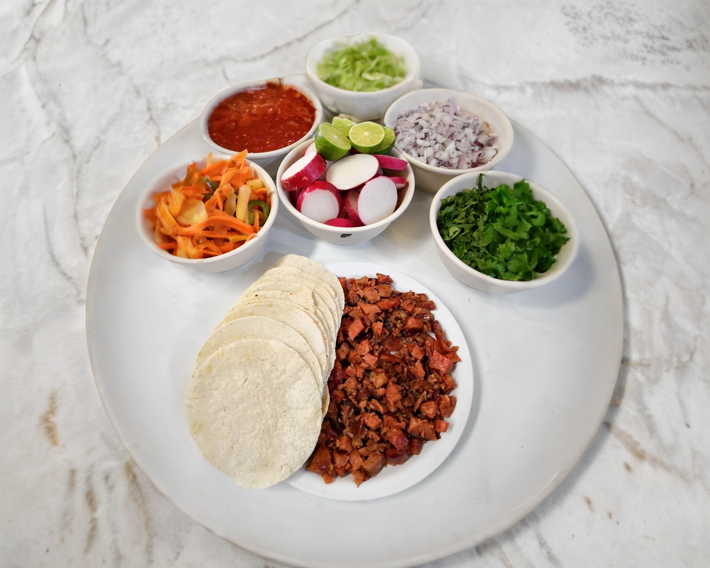 250 gr. Incluye tortillas para 12 tacos y guarniciones de cebolla, cilantro, rabanos, limones, fruta en vinagre, salsa roja y verde.