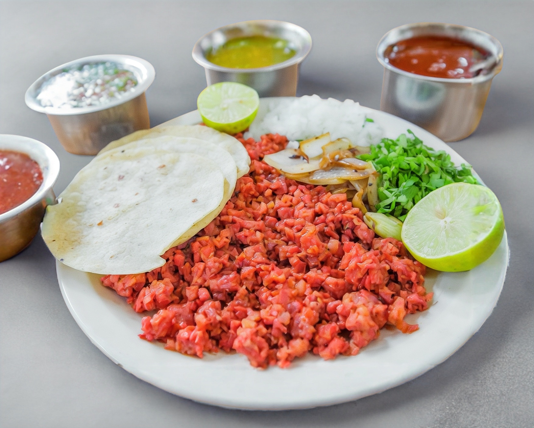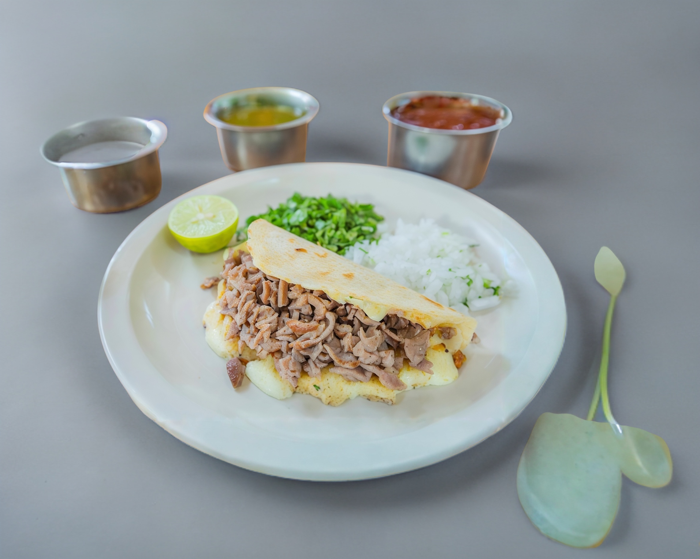 1 tortilla # 12 de harina con queso Oaxaca y carne al pastor, cebolla blanca, cilantro, limones salsa roja. Por unidad