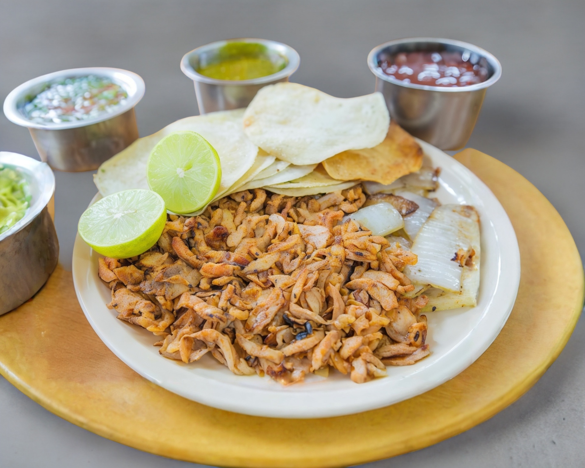 Taco Sencillo de Carne de Puerco, 2 tortillas de maíz #11, Porción de carne de puerco,Cebolla blanca picada finamente, Cilantro fresco picado, Guacamole Salsa roja