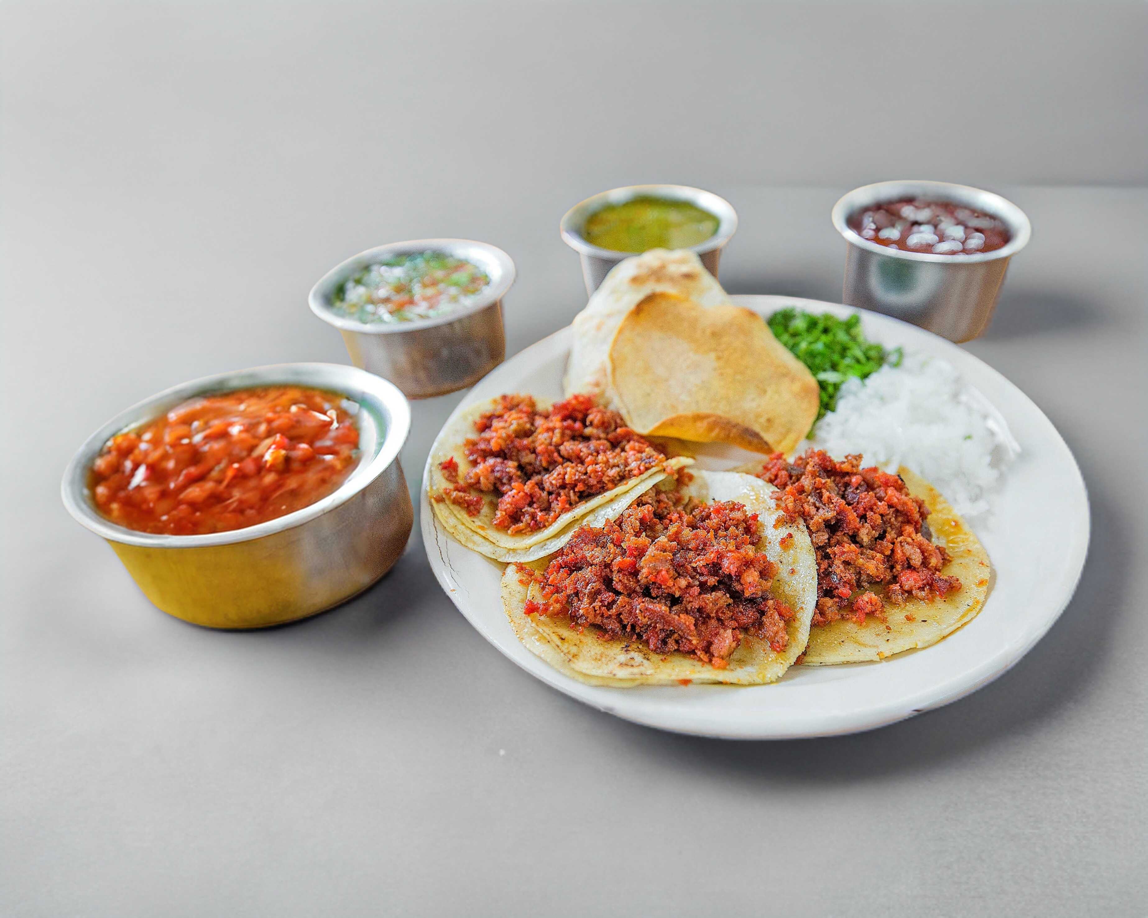 Taco de Chorizo, 2 tortillas de maíz #11, Cebolla, Cilantro, Guacamole,Salsa roja