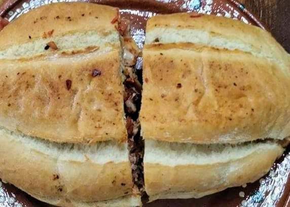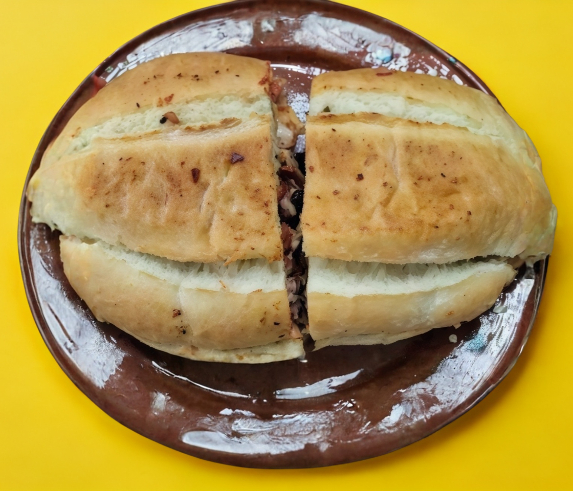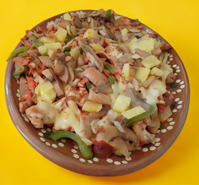 2 Tiras de bistec asado, champiñones, queso y ensalada.