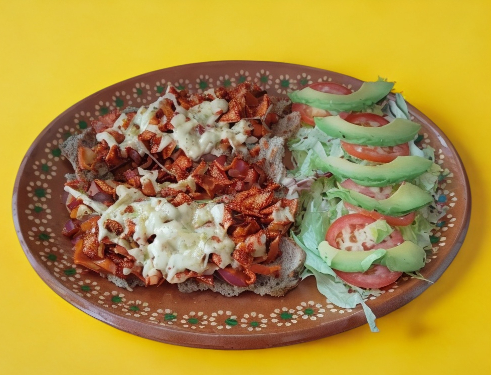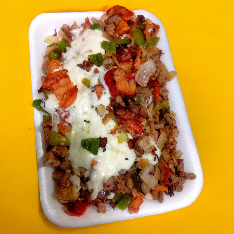 Morrón, cebolla, tocino, bistec, chuleta, pastor, queso y aguacate.
