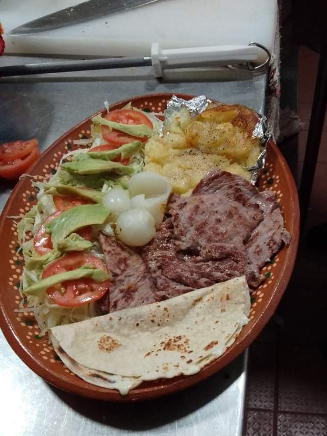 2 Tiras de bistec asado, pastor, queso y ensalada.