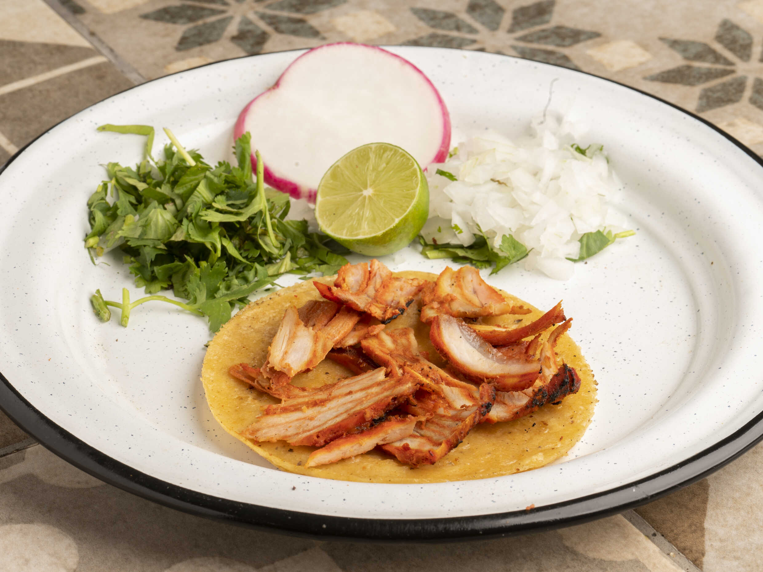 Tacos de carne a elegir, tortilla de maíz y complementos.