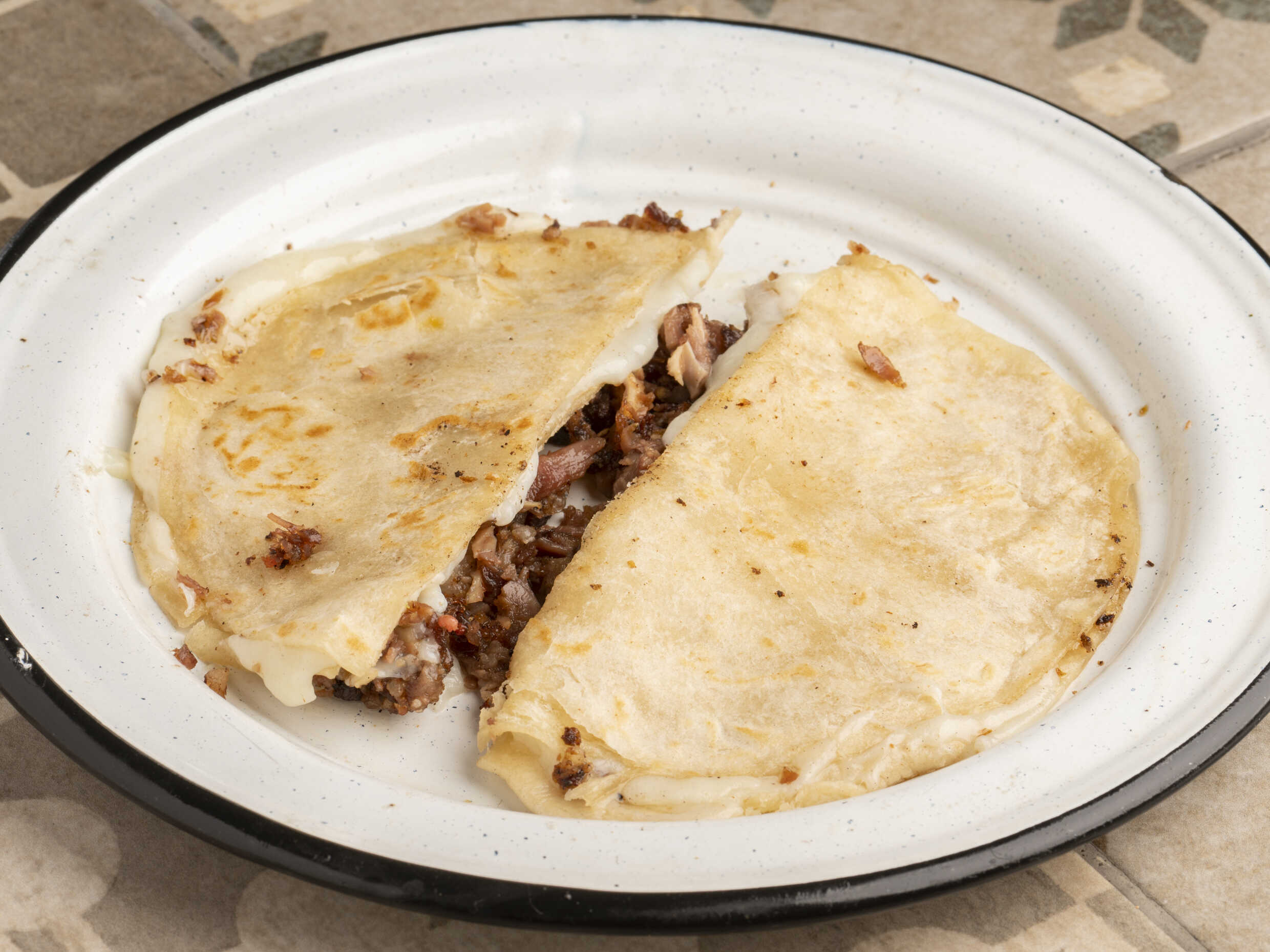 Doble tortilla de harina empalmadas, queso fundido y elección de carne.