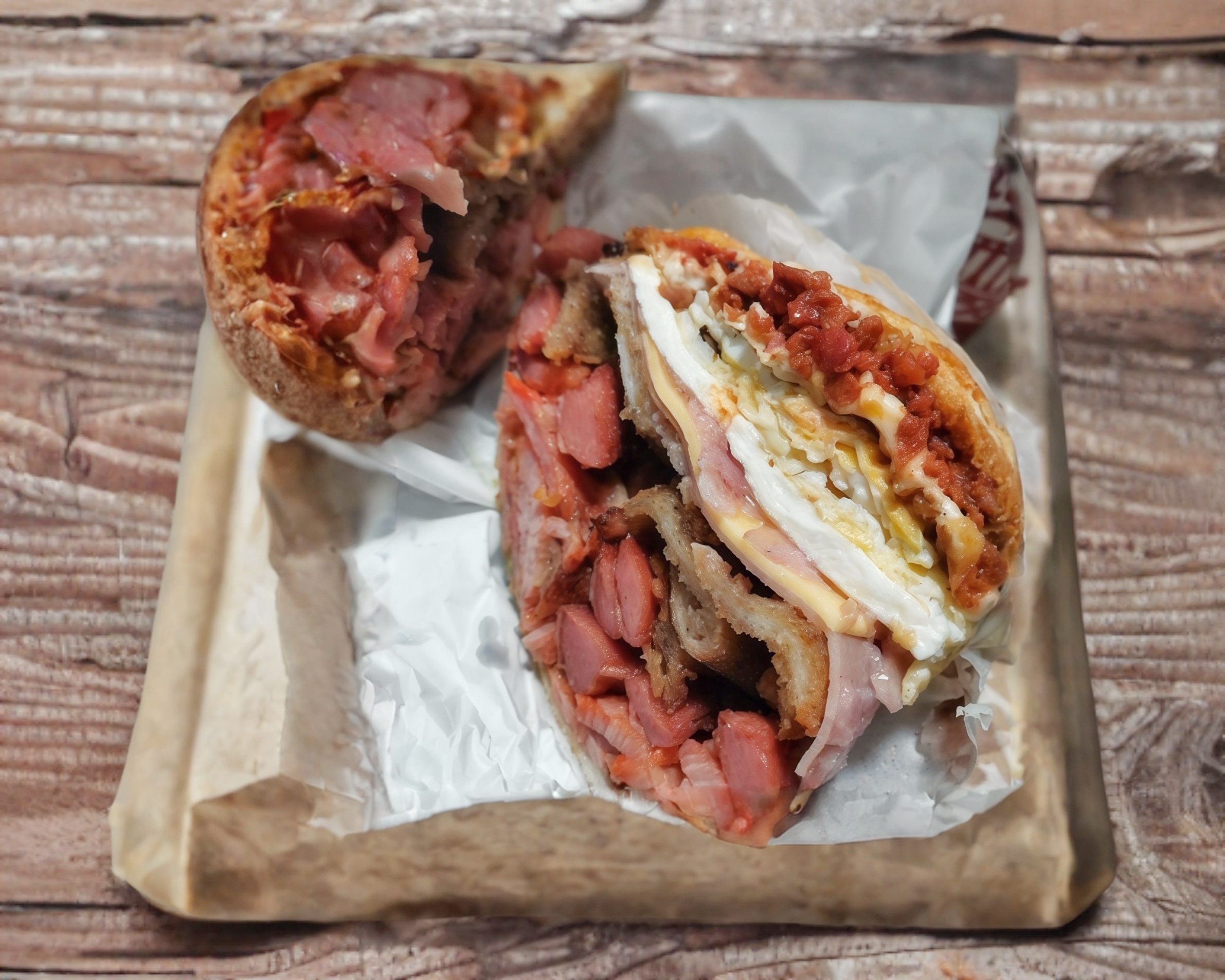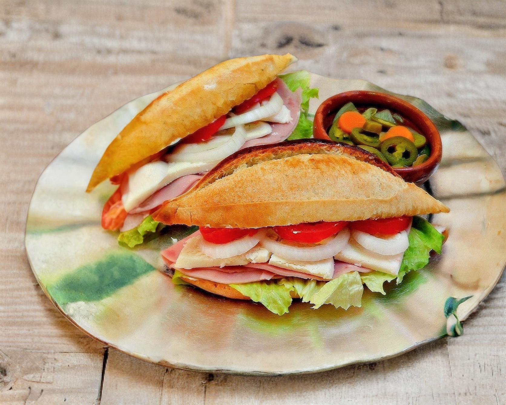 Salchichas, chorizo, pierna, jamón, queso. Preparada con jitomate, cebolla, chile jalapeño, aderezo de chipotle y crema.