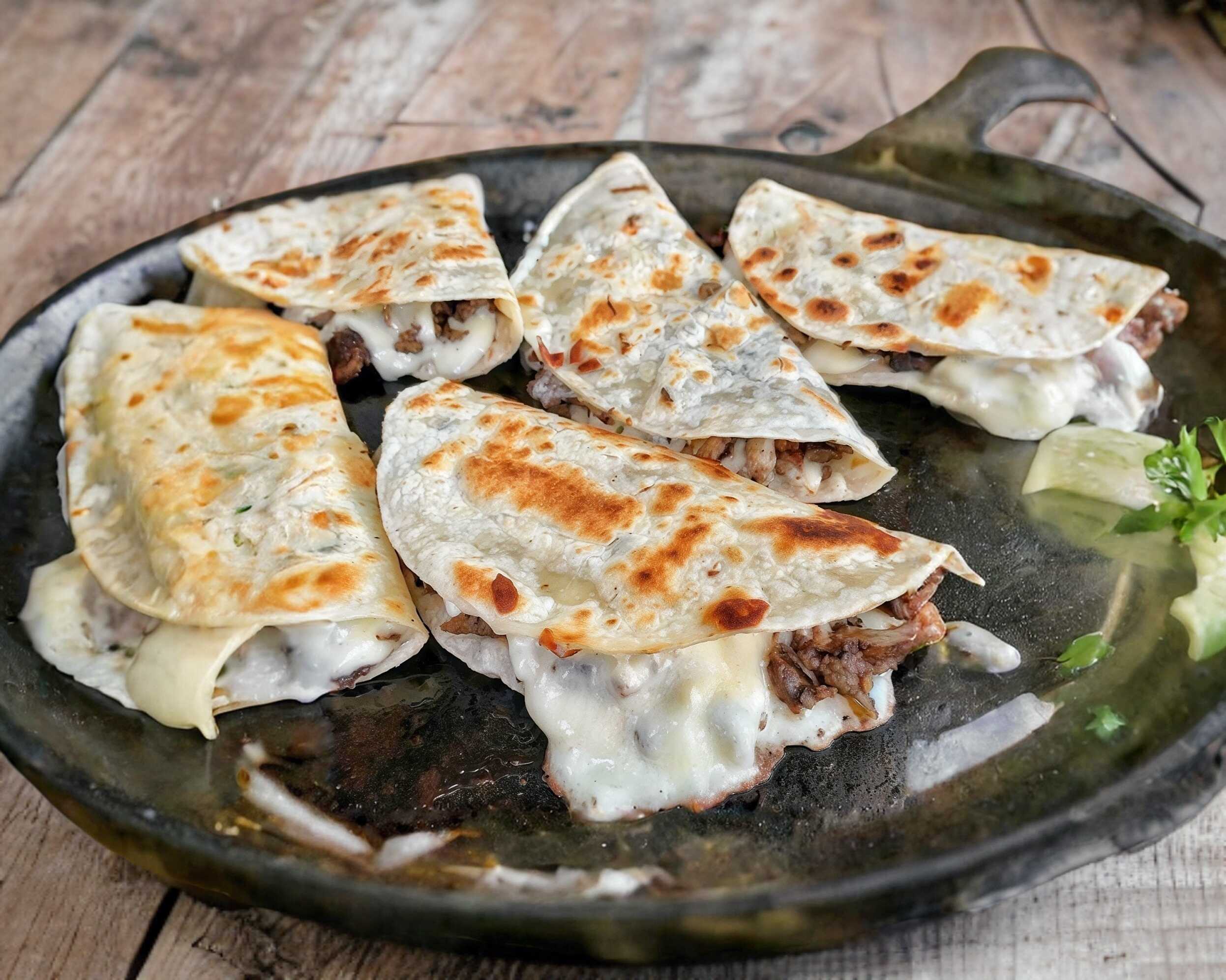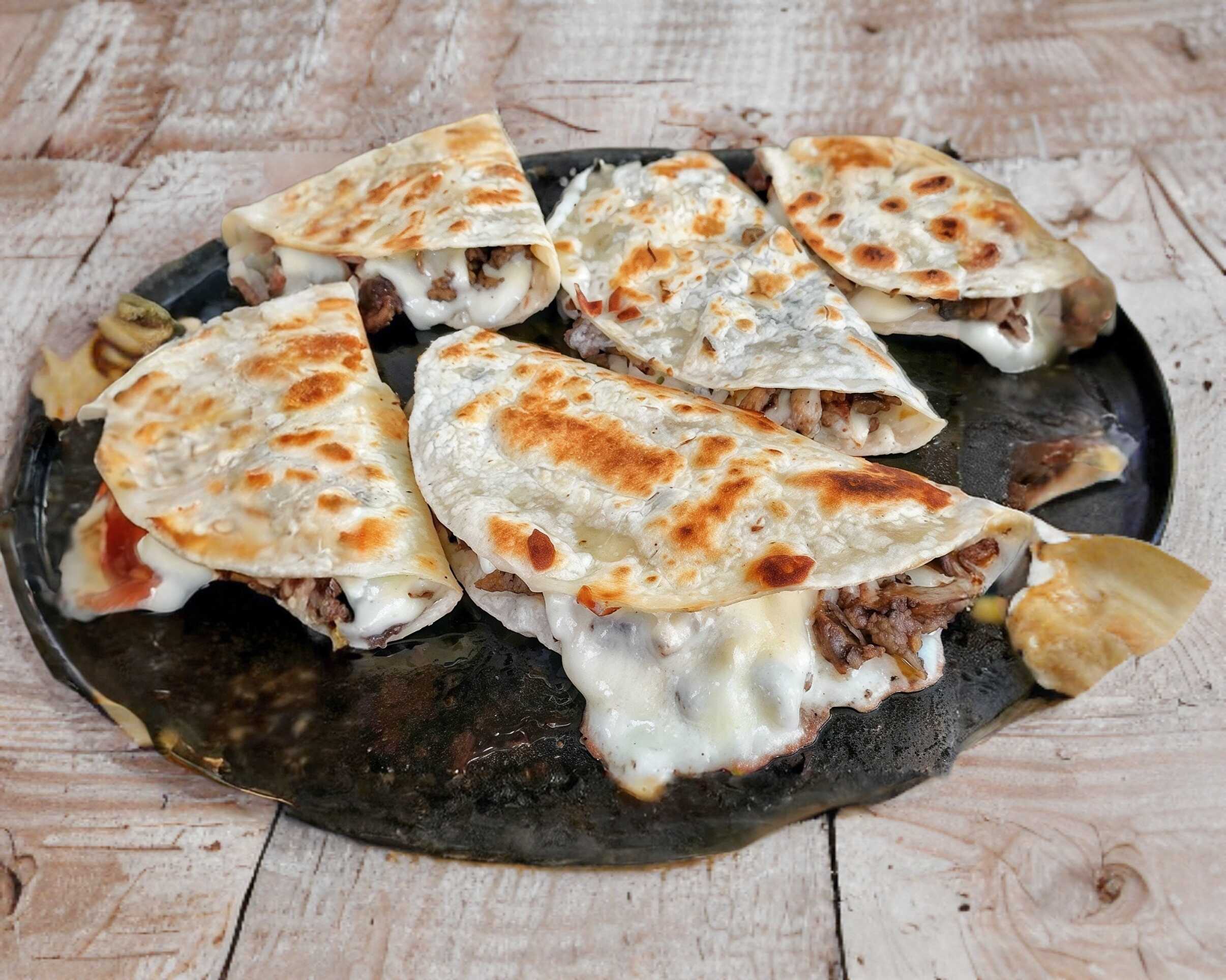 Tortilla de Maíz chica(taquera), queso mozzarella, barbacoa, cebolla, cilantro y chile aparté.