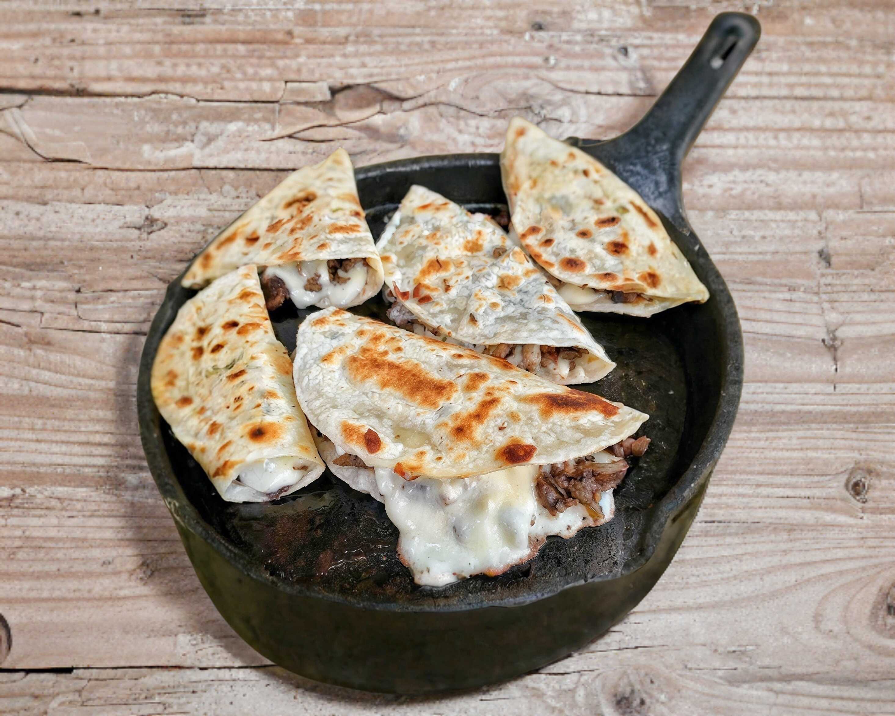 Bistec, chorizo y queso. Preparada con cebolla, cilantro y chile.