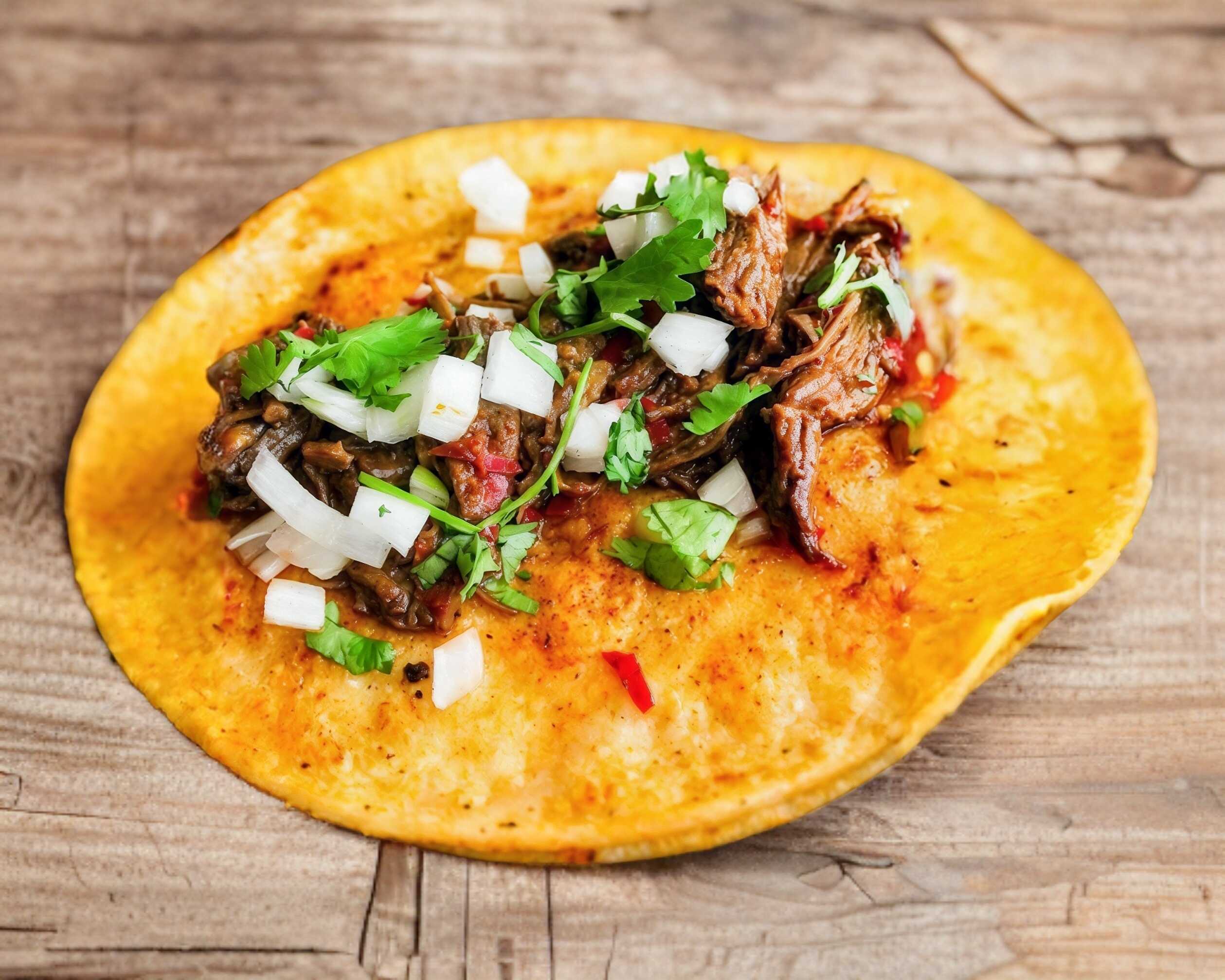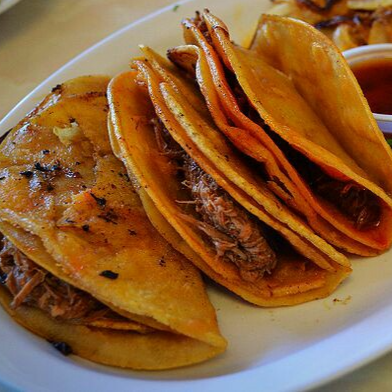 Taco blandito o dorado con tortilla doble de maíz, carne de barbacoa. cebolla, chile. Taco por unidad