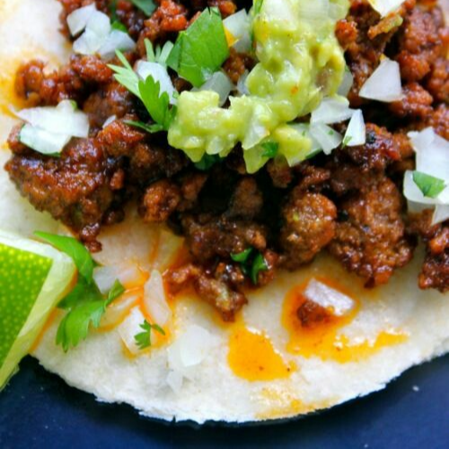 Tortilla de Maíz chica, queso, carnaza, cebolla, cilantro y chile aparté