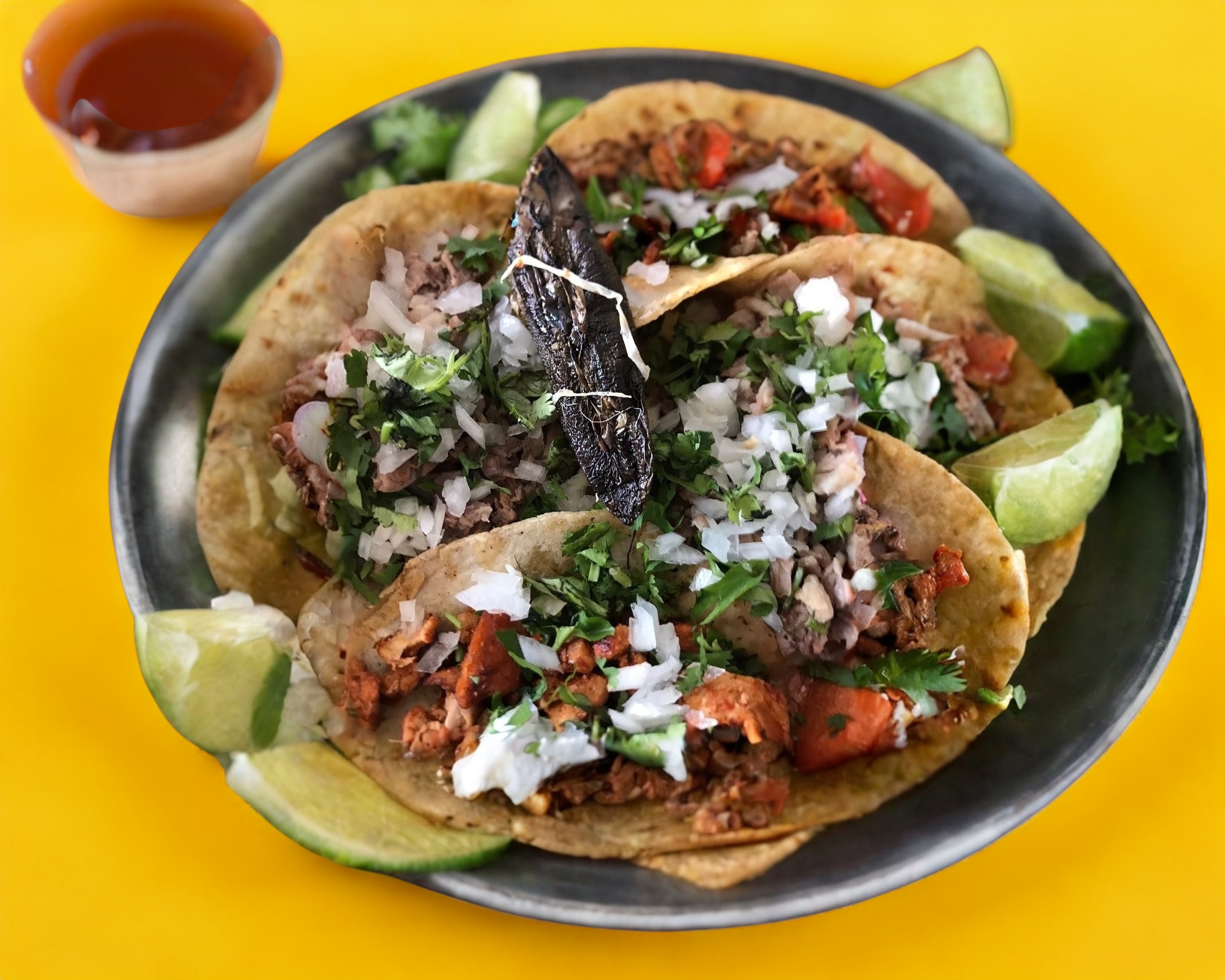 Taco de Bistec y Chorizo: Cebolla, cilantro, jitomate, tomate y salsa de aguacate. ¡Porción mediana llena de sabor!