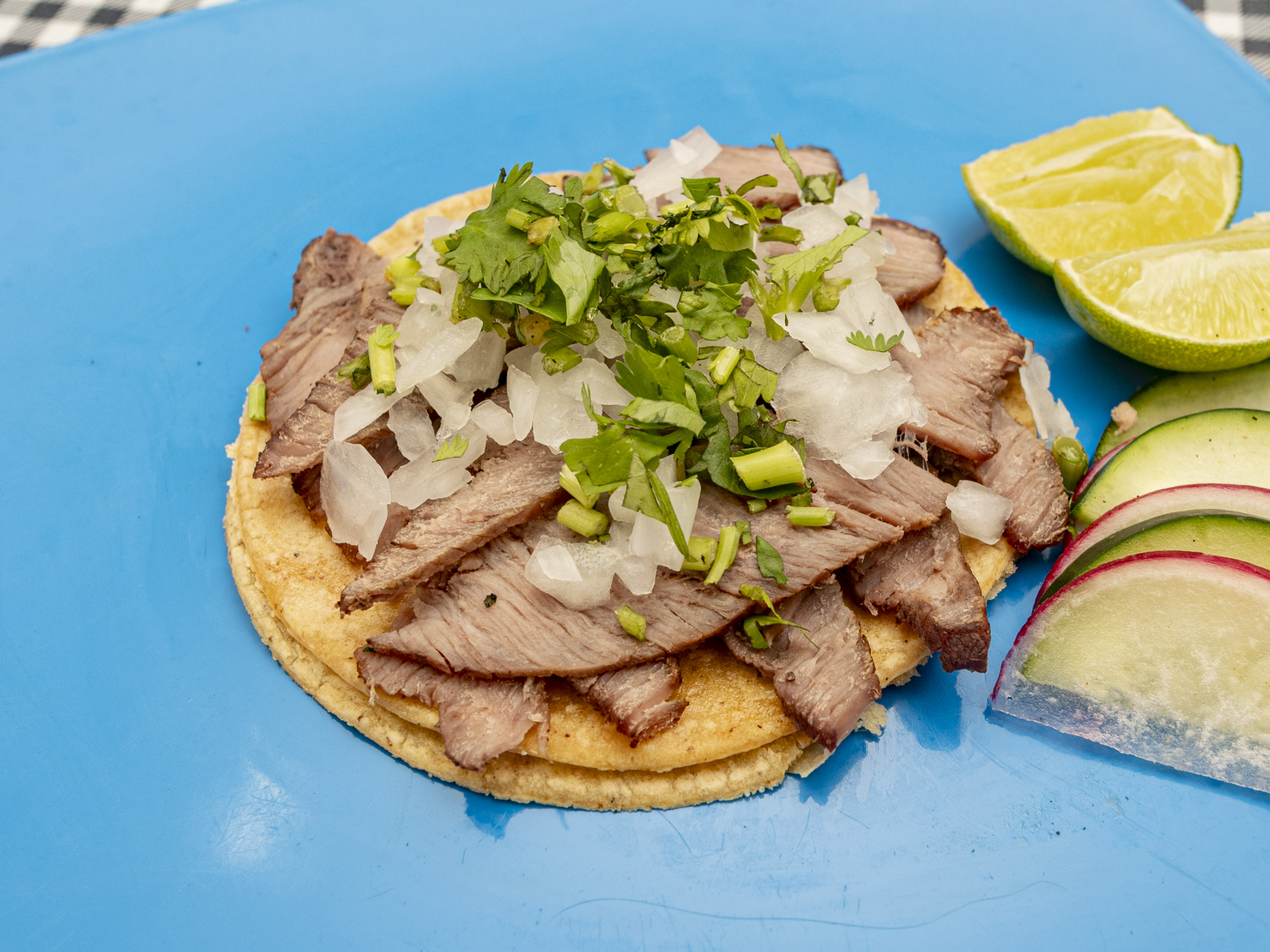 Taco de arrachera prepara con tortilla de maíz acompañado de verduras salsa a elección (verde, roja, guacamole).