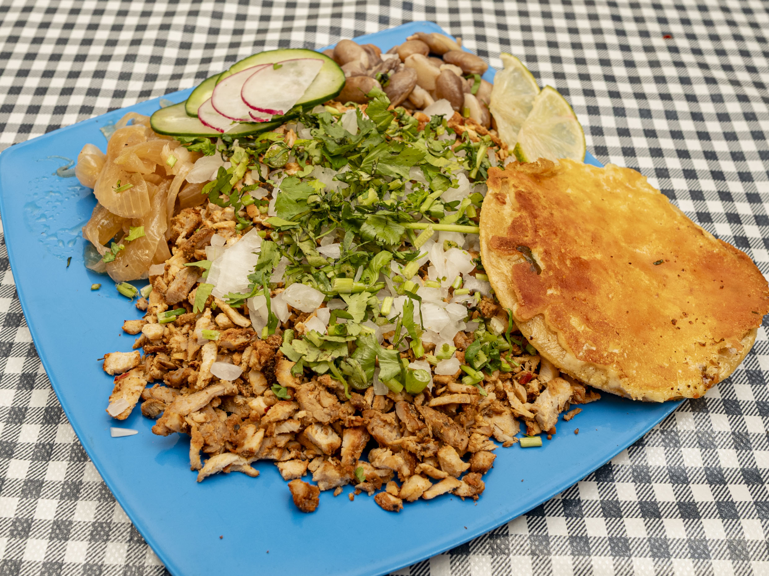 Quesadilla de tortilla de harina acompañada con la carne a su elección, verdura y salsa (verde, roja, guacamole).