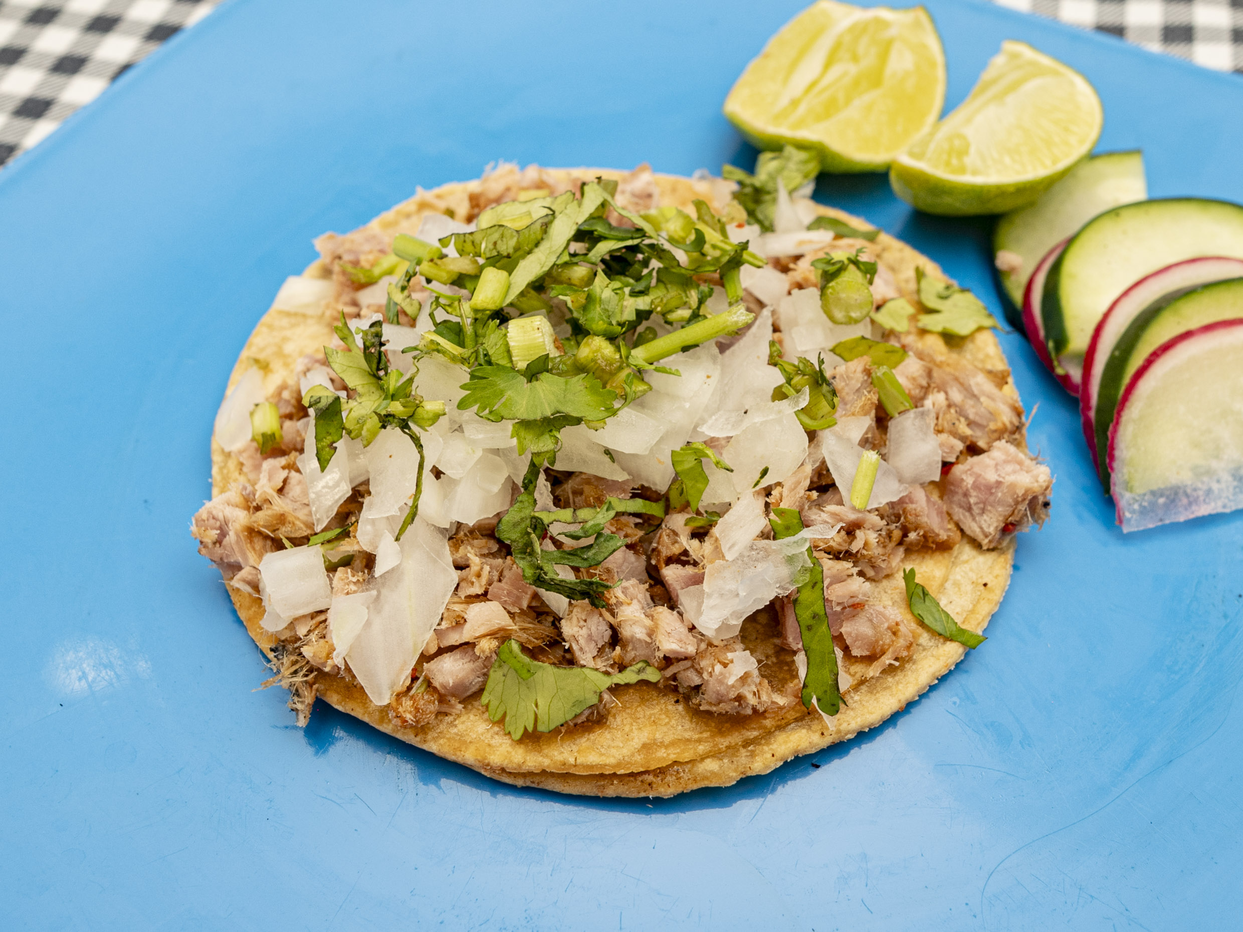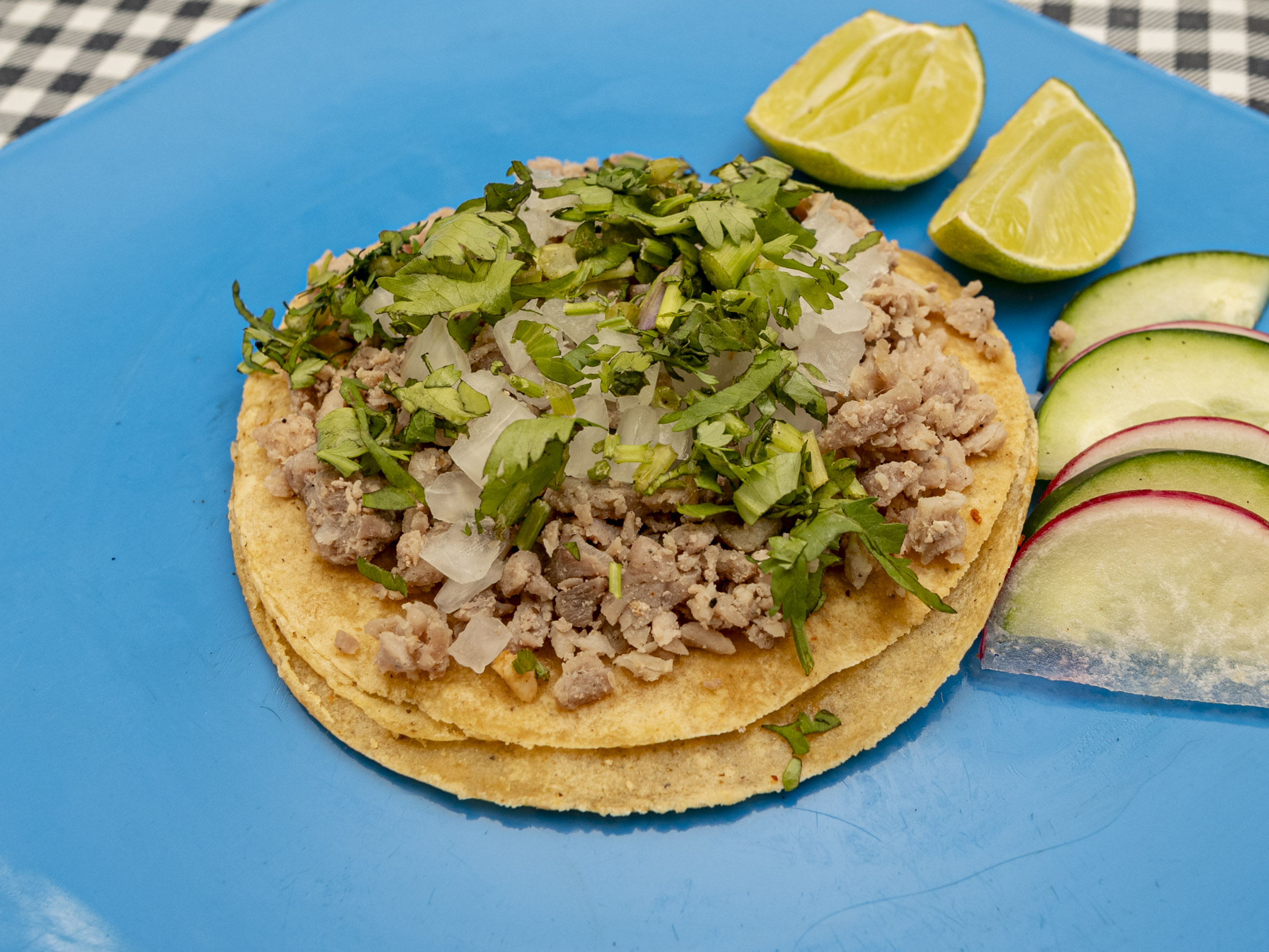 Taco de suadero prepara con tortilla de maíz acompañado de verduras salsa a elección (verde, roja, guacamole).