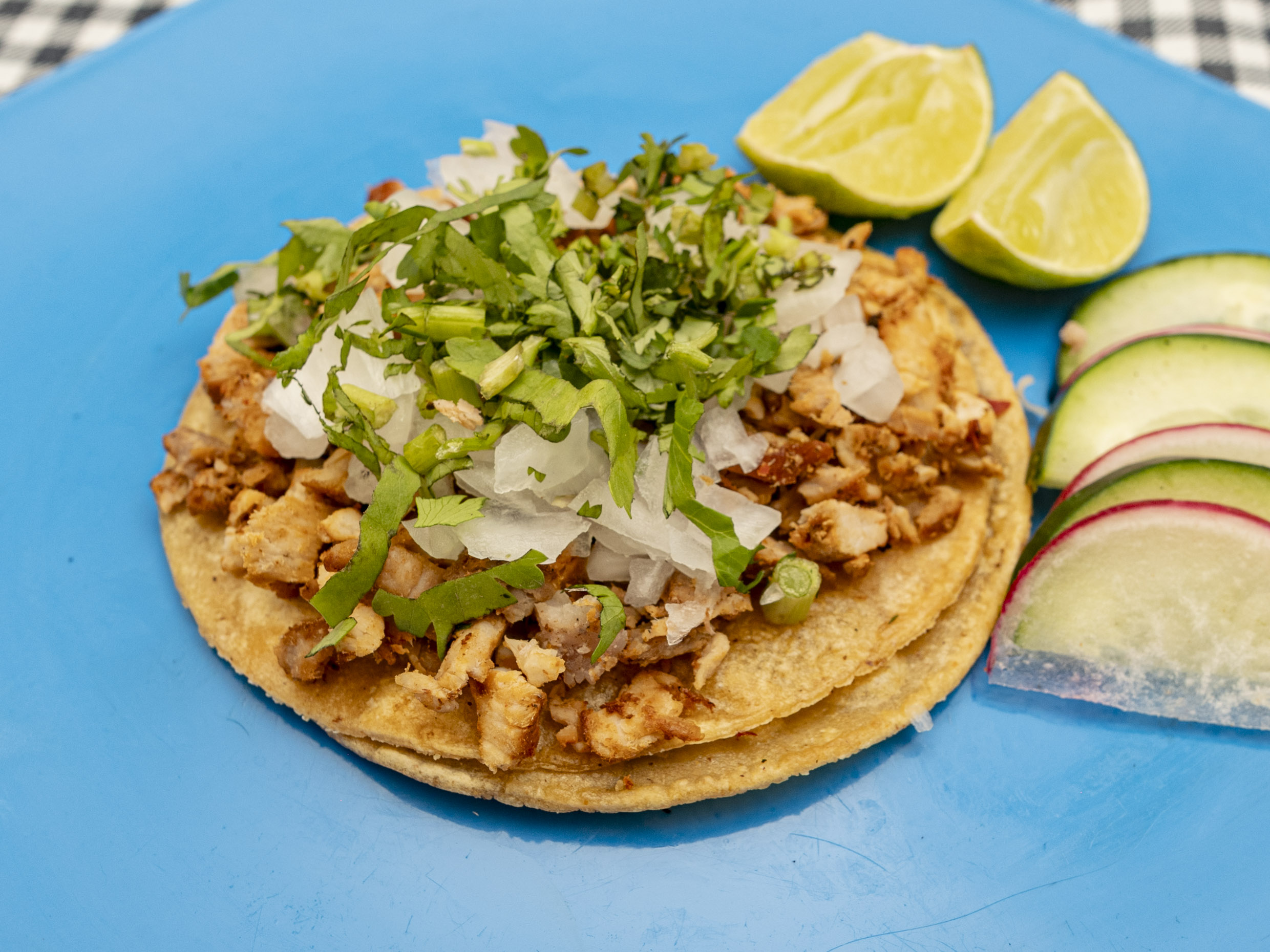 Taco de pastor prepara con tortilla de maíz acompañado de verduras salsa a elección (verde, roja, guacamole).
