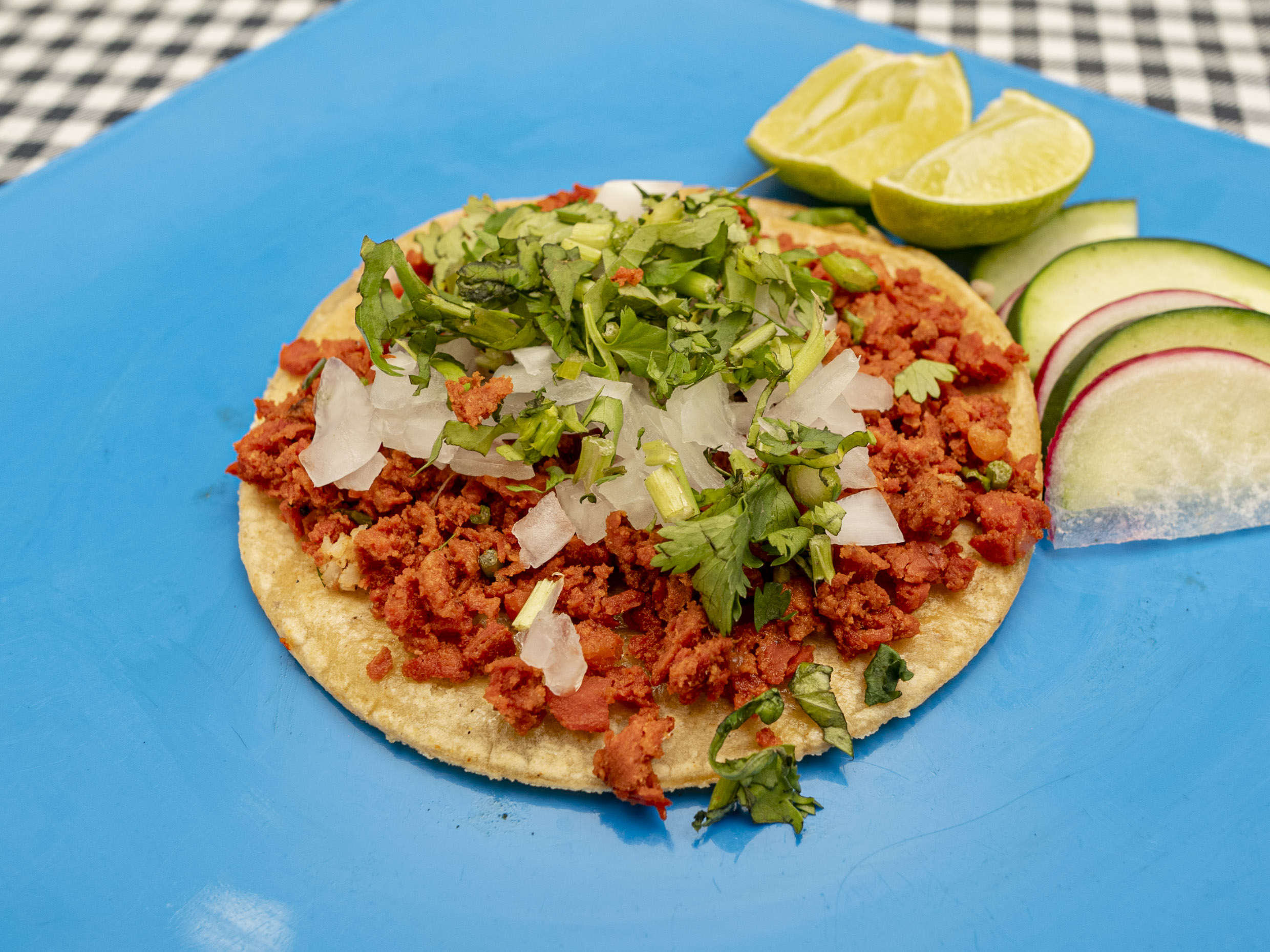 Taco de chorizo c/queso prepara con tortilla de maíz acompañado de verduras y salsa a elección.