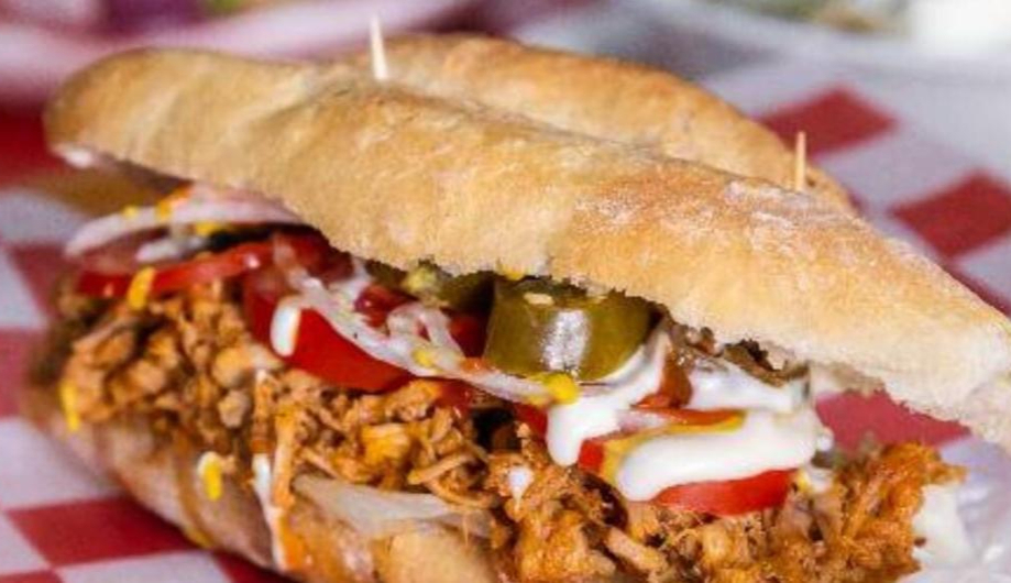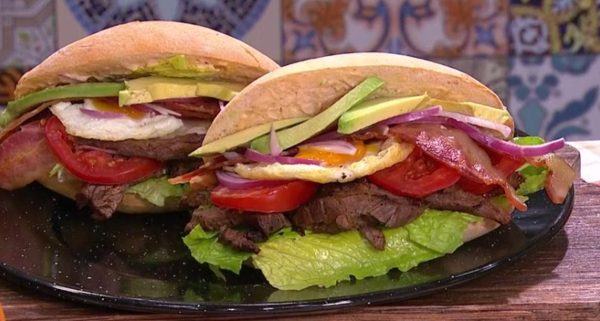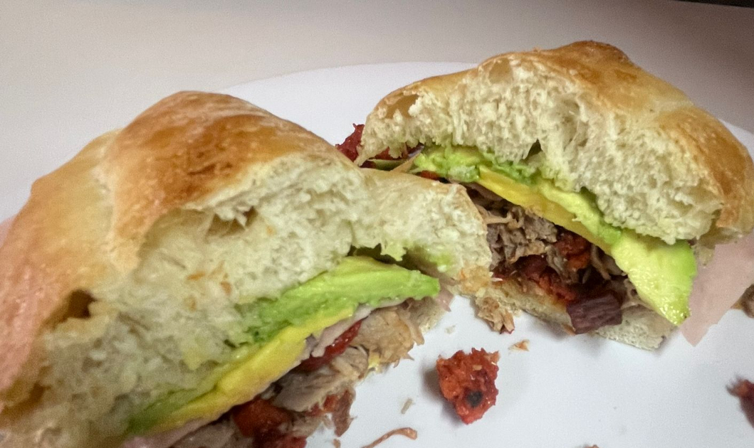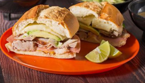 Elaborado a base de bolillo, pierna, jamón, salchicha, tocino, queso amarillo y aguacate y verdura aparte.