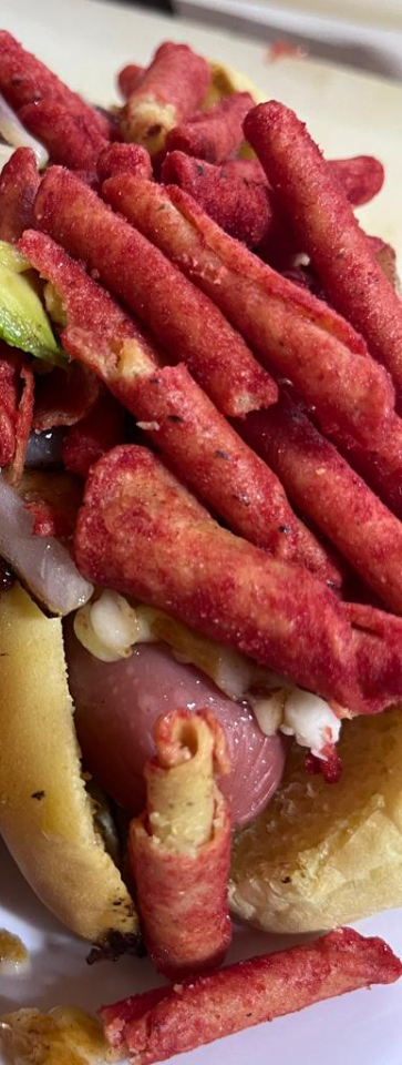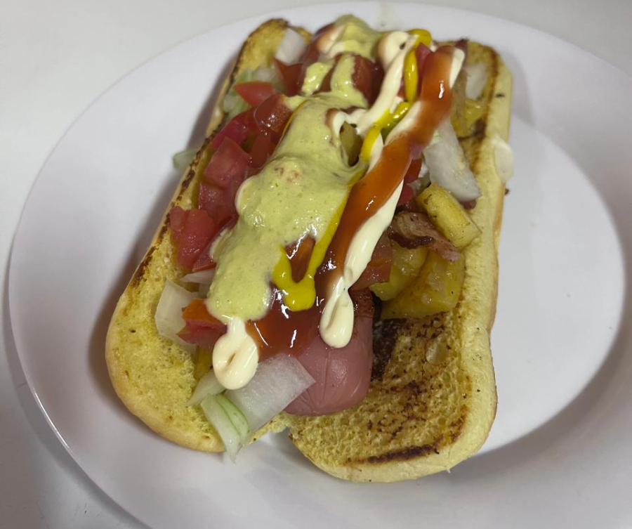 Salchicha envuelta en tortilla de harina, frita, queso gratinado, cebolla guisada, tocino y aguacate.