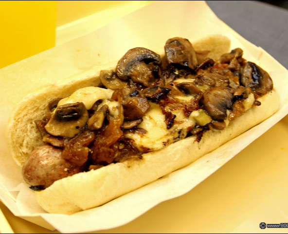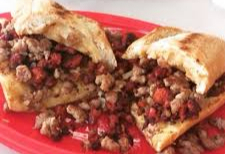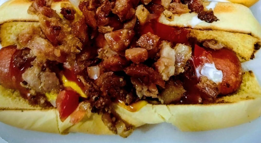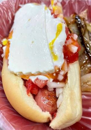 Salchicha, chile güero, chile guisado, cebolla guisada, queso gratinado y tocino.