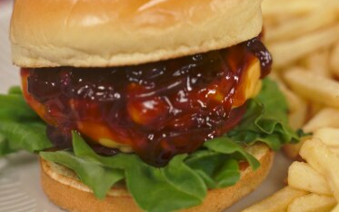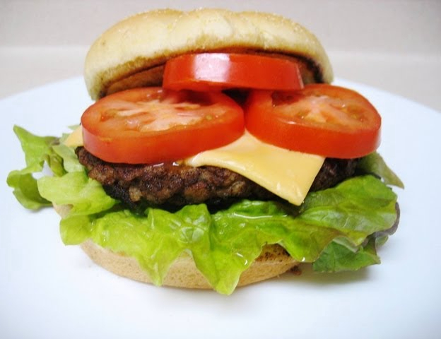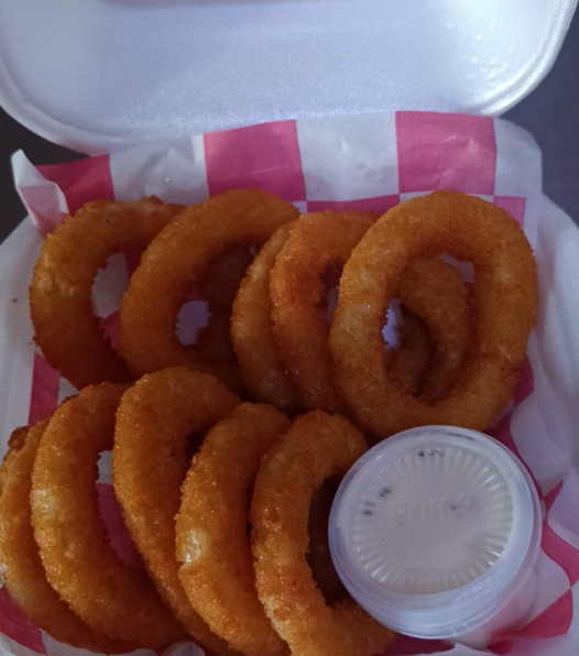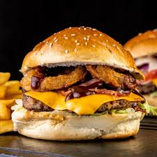 Doble carne de res, queso fundido blanco y amarillo, tocino, aros de cebolla y verdura aparte.