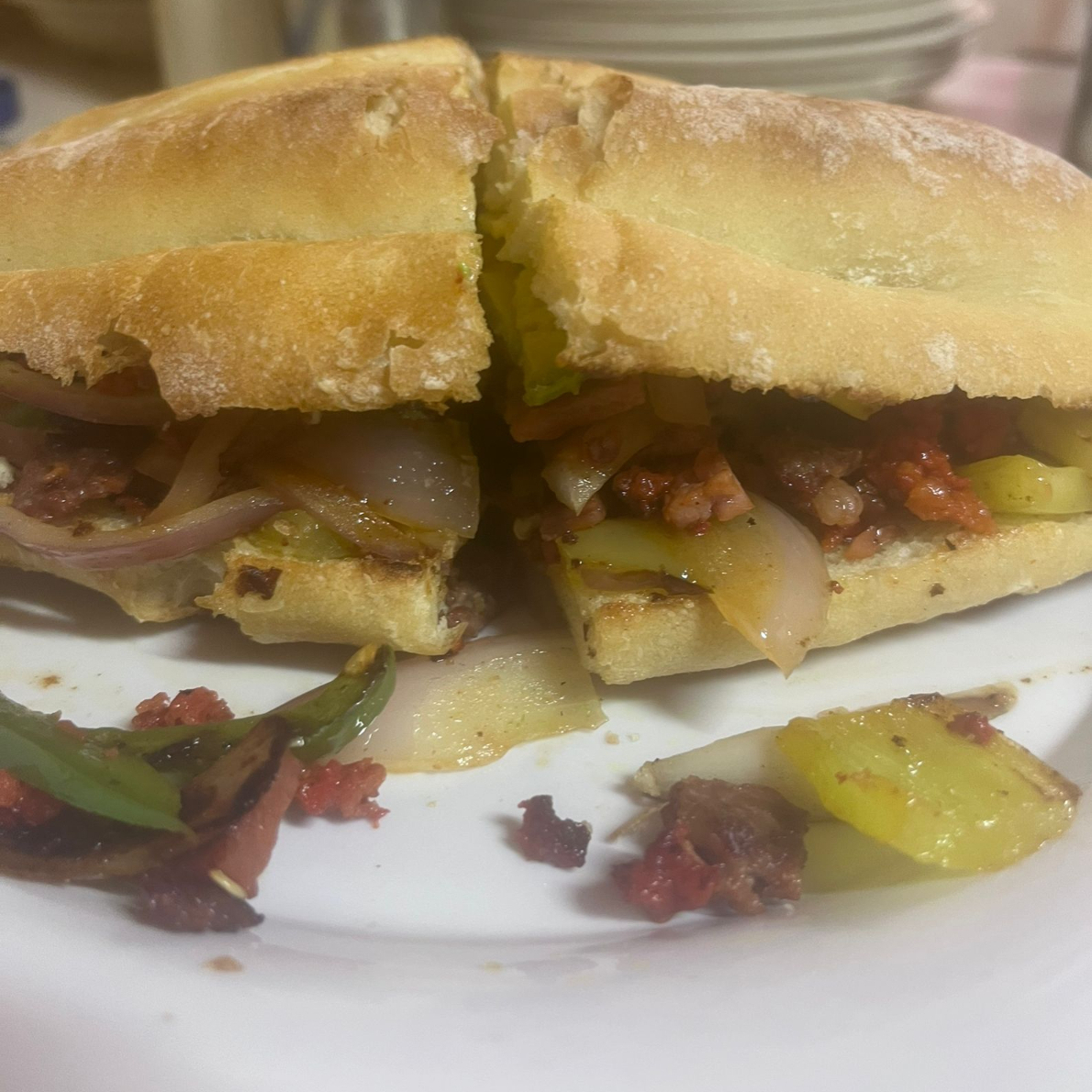 Elaborado con bolillo, bistec con chorizo y verdura aparte.