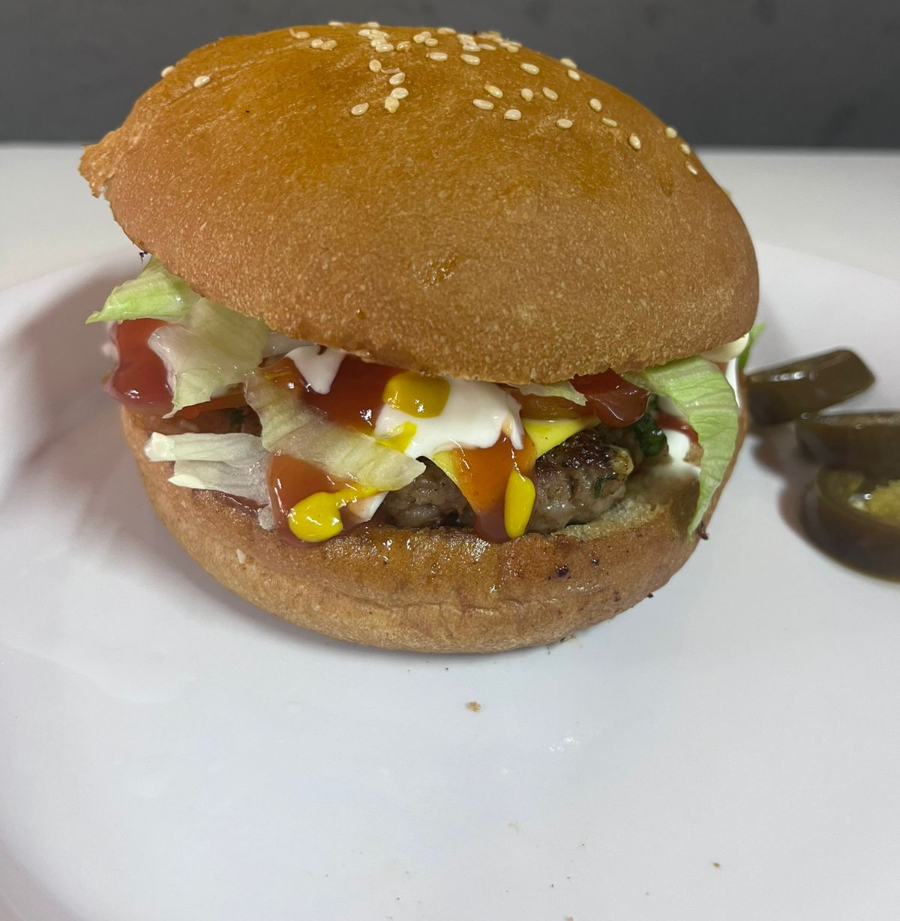 Triple carne de res, queso asadero amarillo, chorizo, salchicha, tocino y verdura aparte.