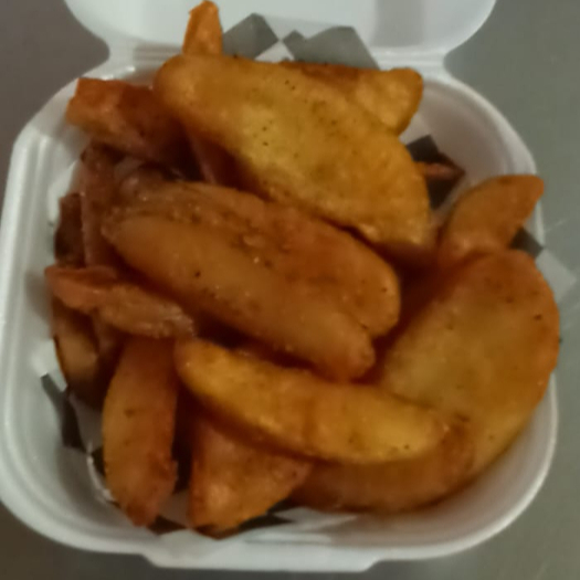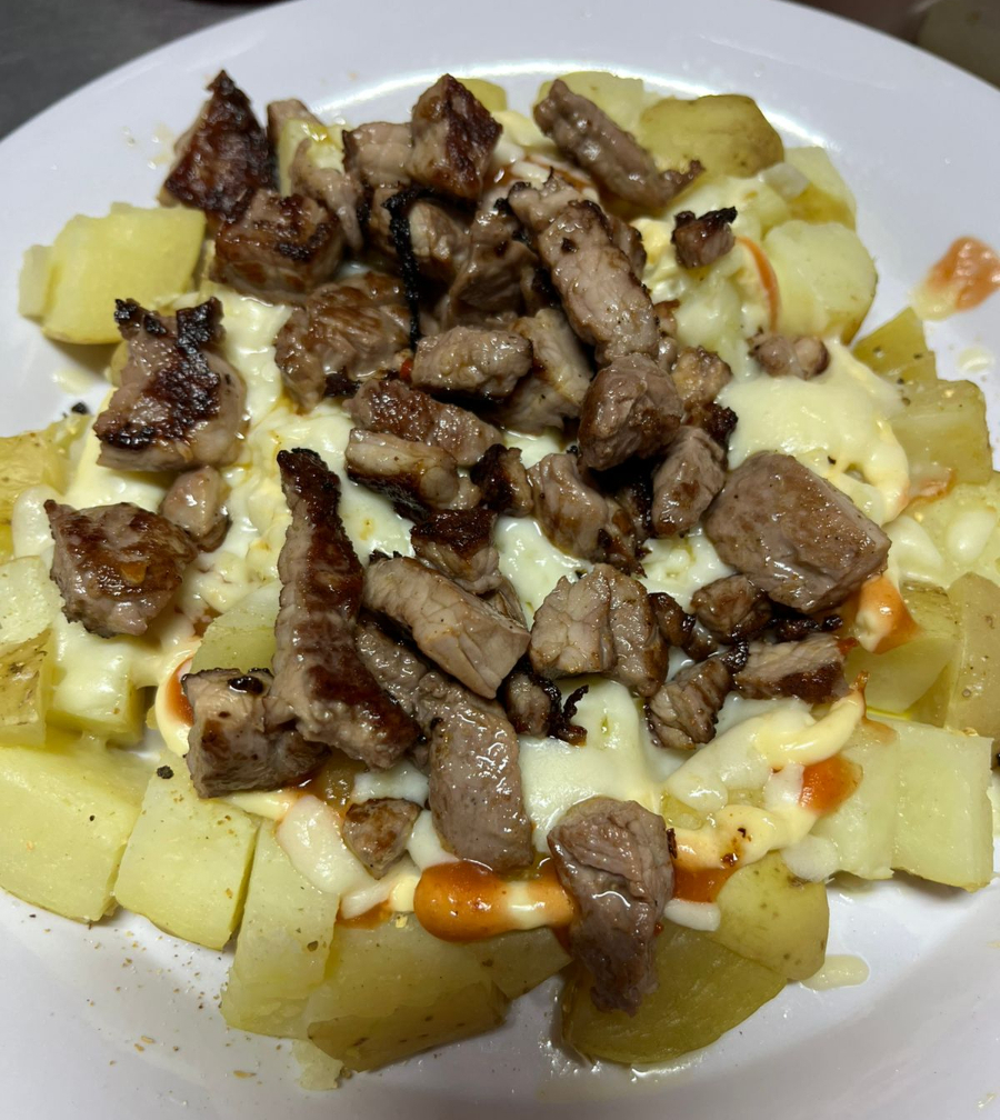 Papa cocida y picada acompañada de aderezos, queso gratinado.