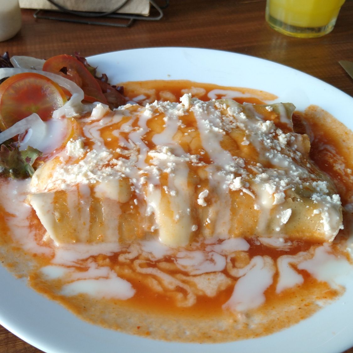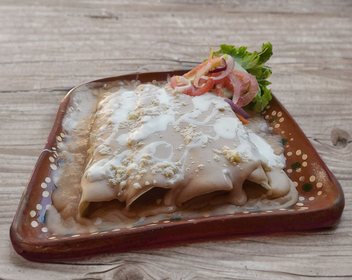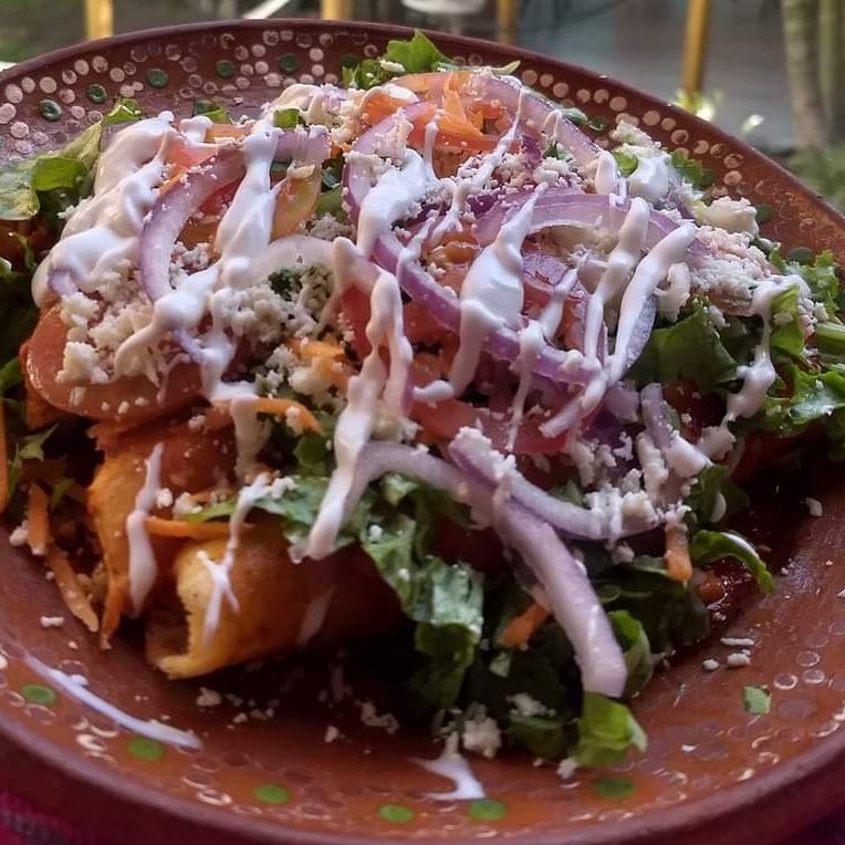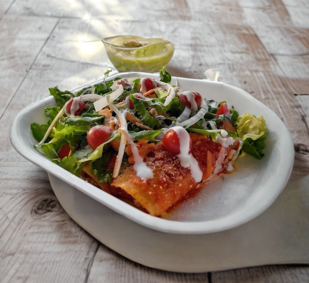 4 enchiladas de cebolla y queso bañadas en salsa especiasl de la casa, cubiertas con vegetales frezcos (lechuga , zanahoria rayada, jitomate y cebolla) queso seco y crema