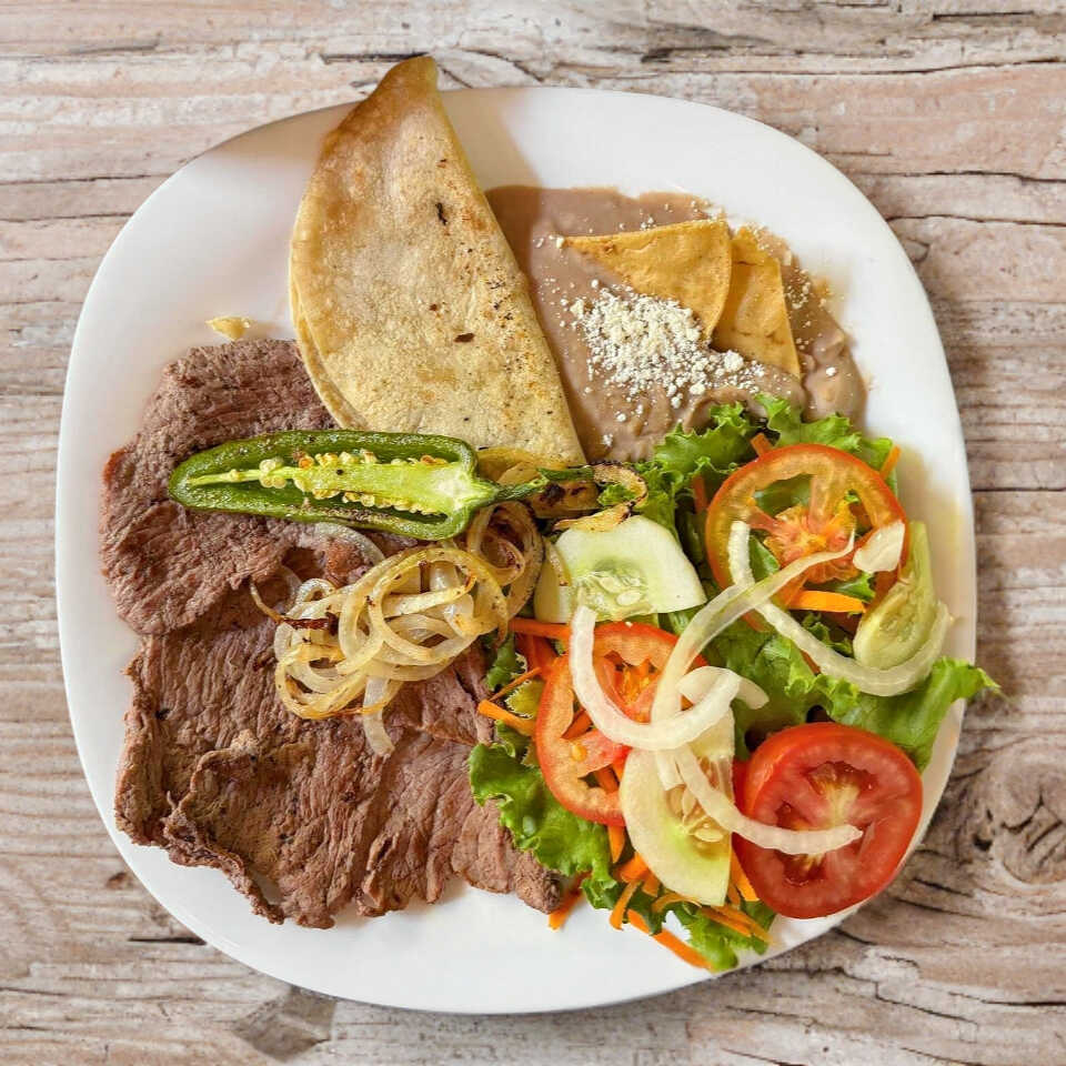 135 gramos de arrachera, asada a la plancha , incluye una quesadilla frijoles, ensalada de vegetales frescos , chile toreado, cebolla guisada, salsa picante y tortillas