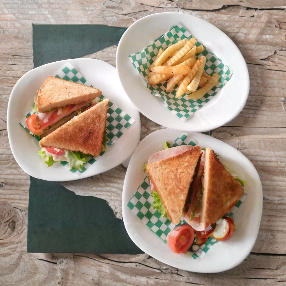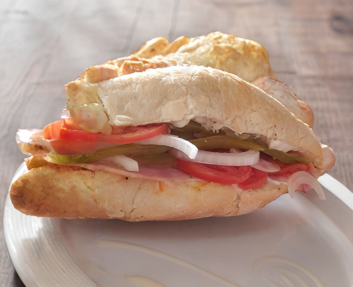 2 Sandwich de jamón con lechuga, zanahoria, pepino, jitomate cebollay jalapeños, acompañados con una porcion de papas a la francesa
