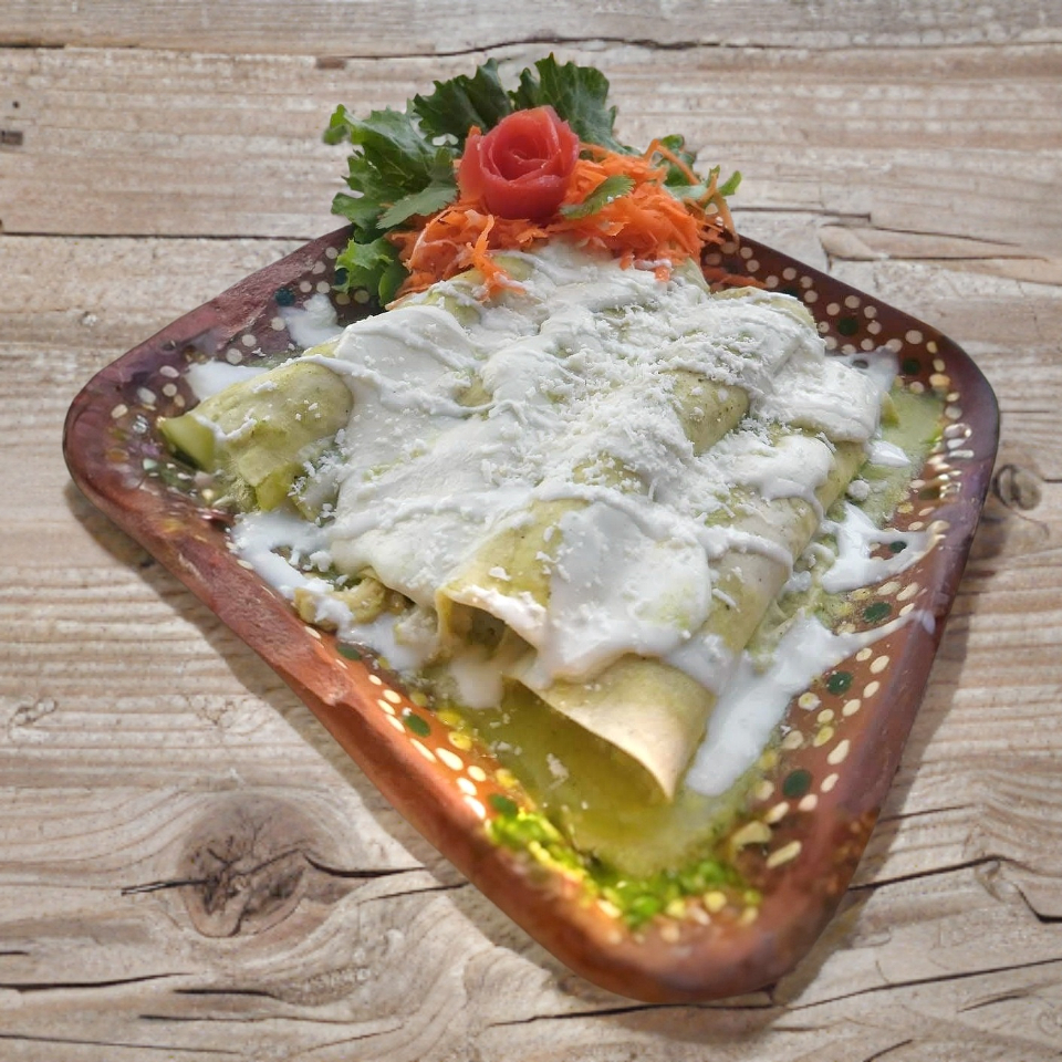 4 enchildas bañadas en salsa verde espacial de la casa cubiertas con lechuga, zanahoria rayada.jitomate cebolla, queso seco y crerma.
