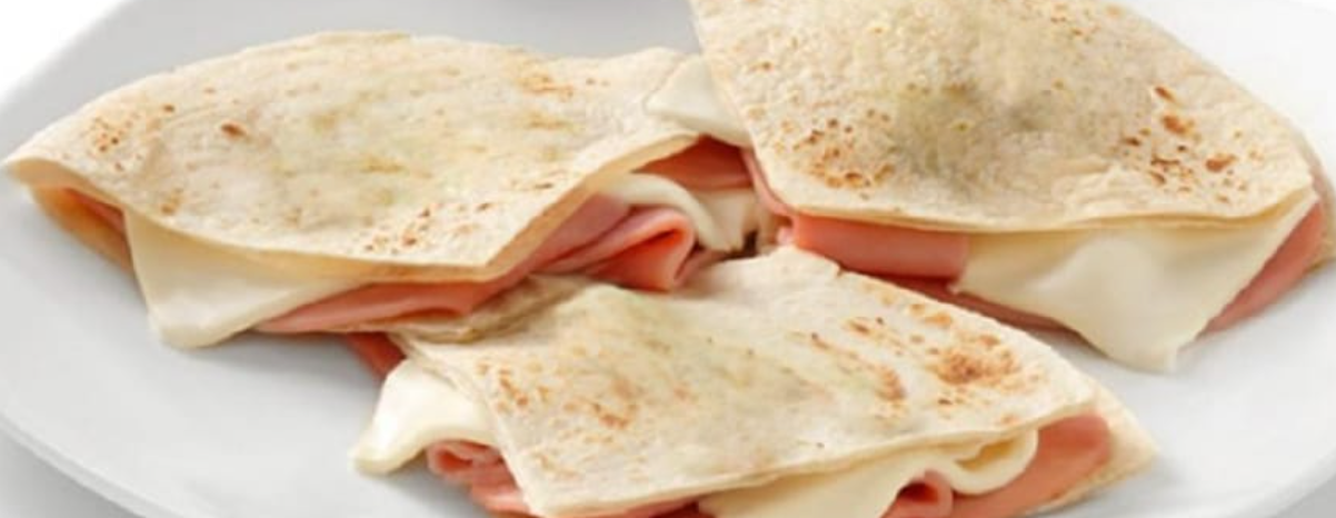 Tortilla de harina chica con el ingrediente de tu elección (pierna, panela o jamón ) acompañado con vegetales frescos, chiles jalapeños , salsa tipo catsup mostaza y crema aparte. la orden incluye 2 piezas.
