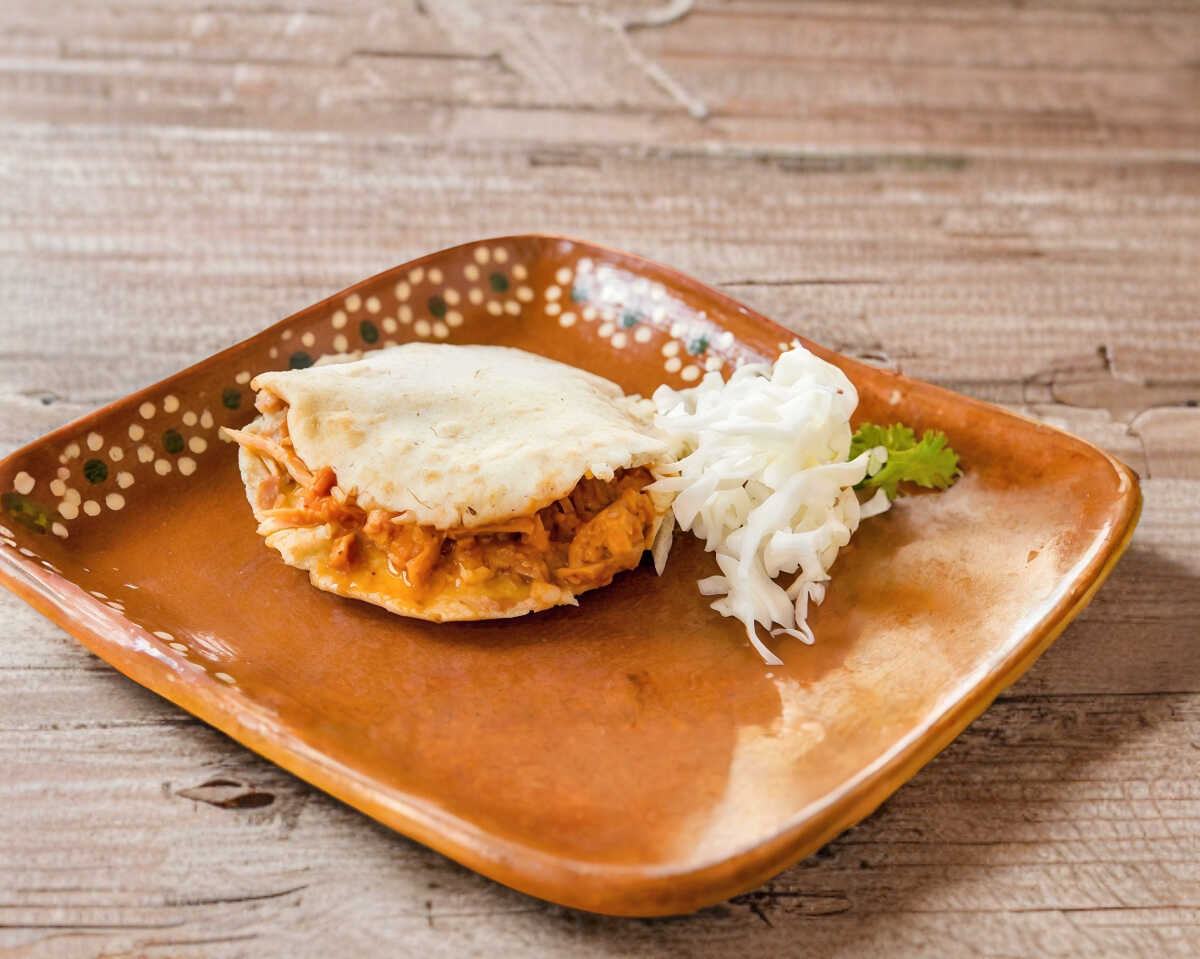 1 quezadilla de masa frita rellena de queso de fundir, complementos de crema queso salsa picante y repollo