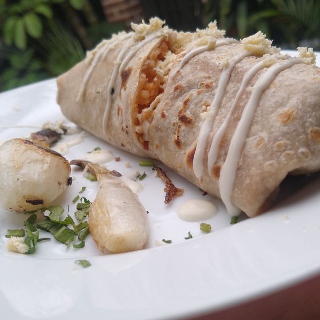 Relleno de frijolitos ,arroz, la carne o guiso tu agrado cebolla y cilanto todo envuelto en tortilla de harina jumbo, chilas jalapeño aderezos salsa picante aparte.