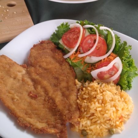 125gr. de diezmillo fresco de res empanizado artesanalmente con el tradicional pan molido de la casa, incluye guarniciones de frijoles refritos, una porción de arroz y ensalada de vegetales frescos, incluye 1 orden de tortillas y salsa picante