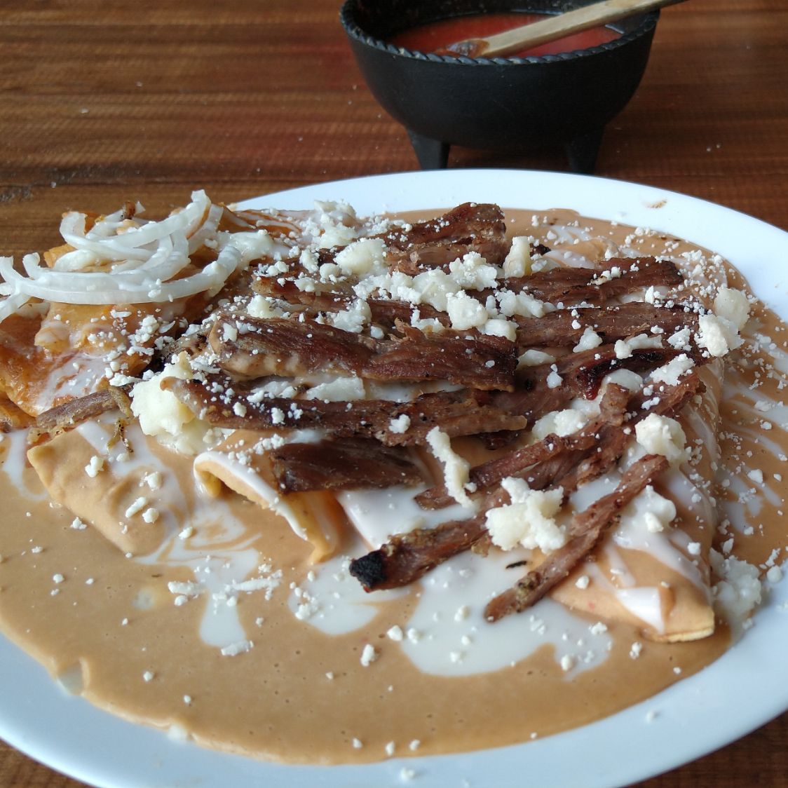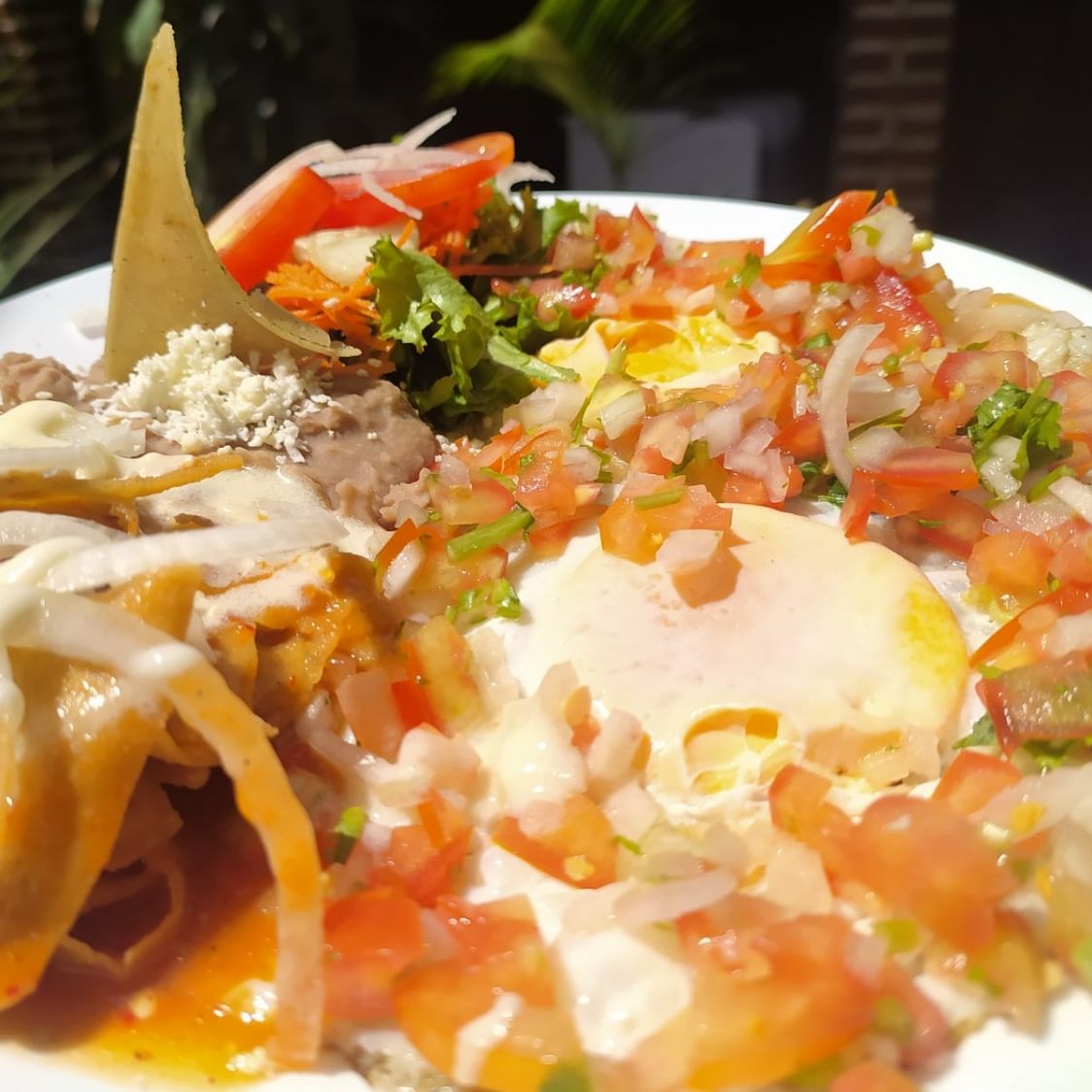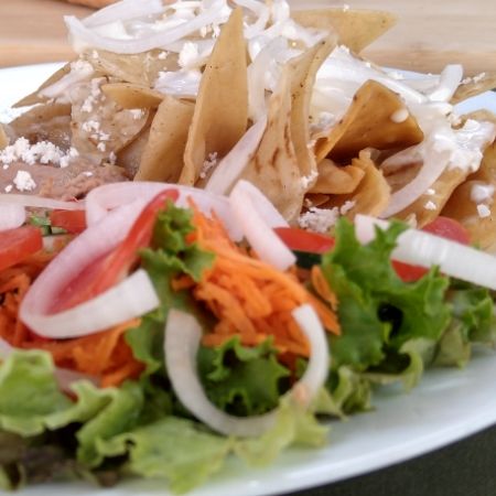 orden de chilaquiles rojos acompañados con guarniciones de frijoles refritos y ensalada, queso crema y cebolla coronados con chicharron prensado guisado , sumamente deliciosos