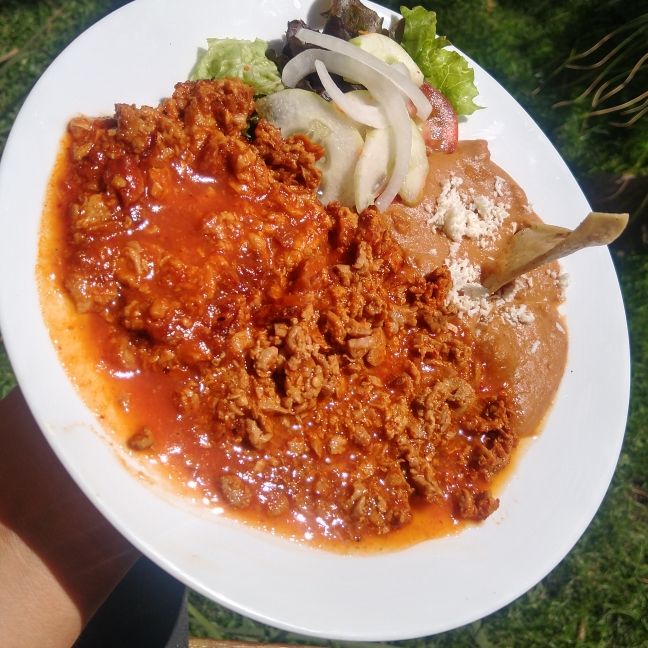 frijoles, salsa mexicana, cebolla guisada