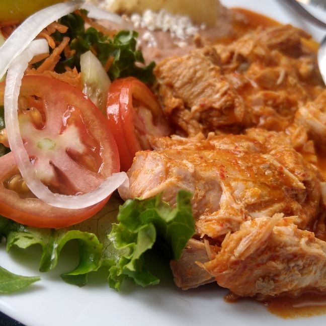 Chicharrón prensado guisado en salsa roja acompañado con frijoles y ensalada