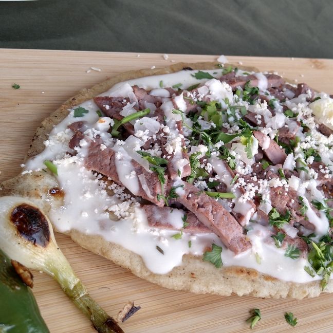 Huarache de masa frito espacial de la casa, de carne asada a elejir de tu preferencia complementado con queso crema cebolla y cilantro , cebolla guisada y un chile toreado.