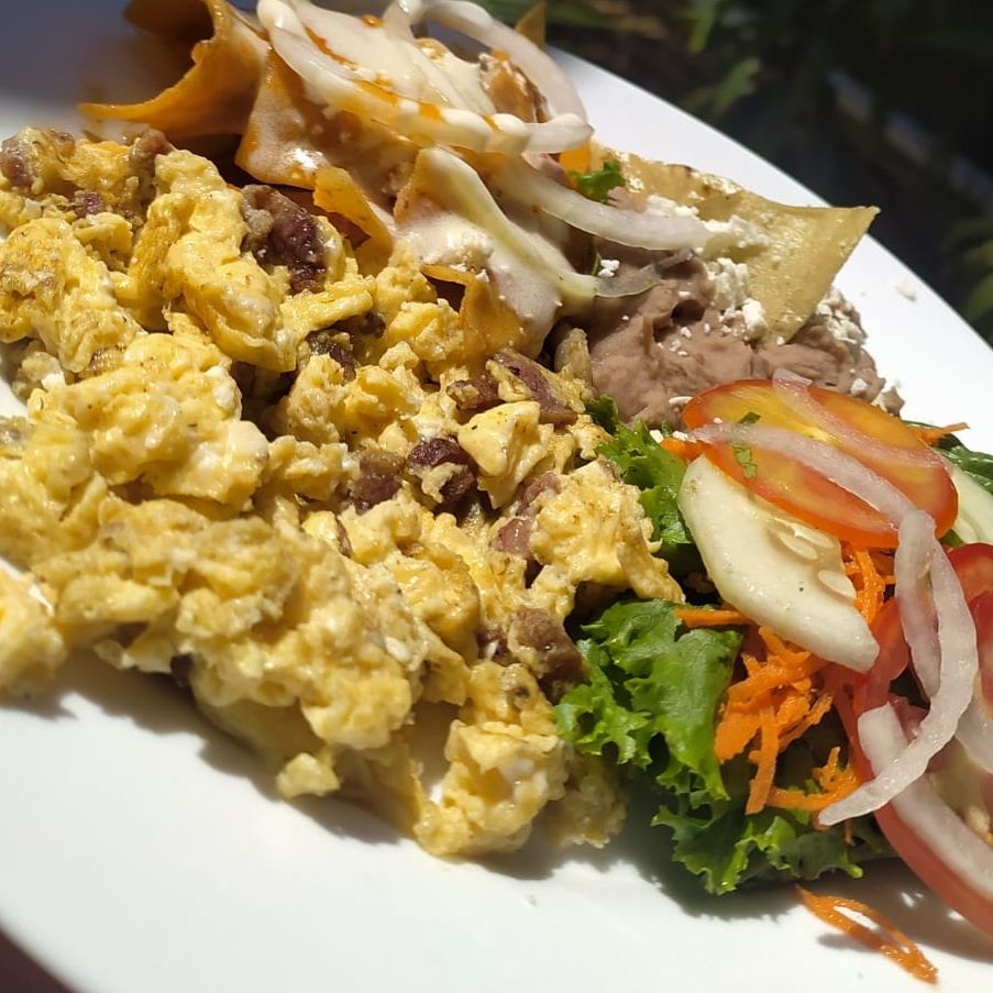 Acompañados de chilaquiles, frijoles y vegetales frescos.