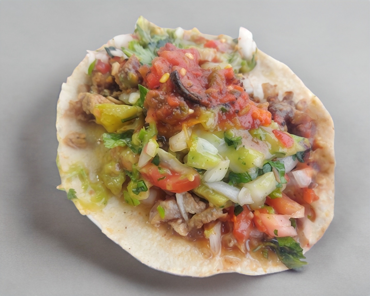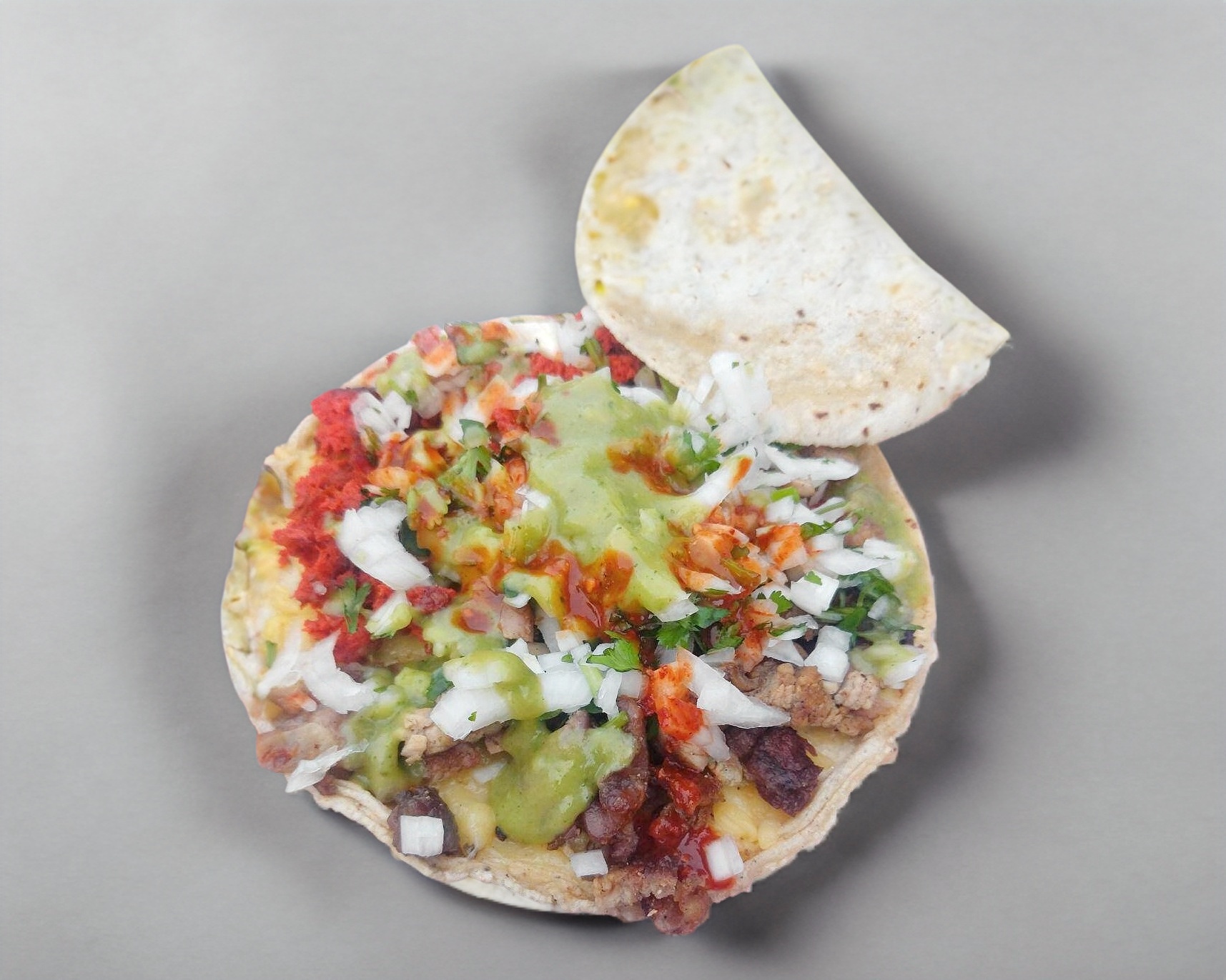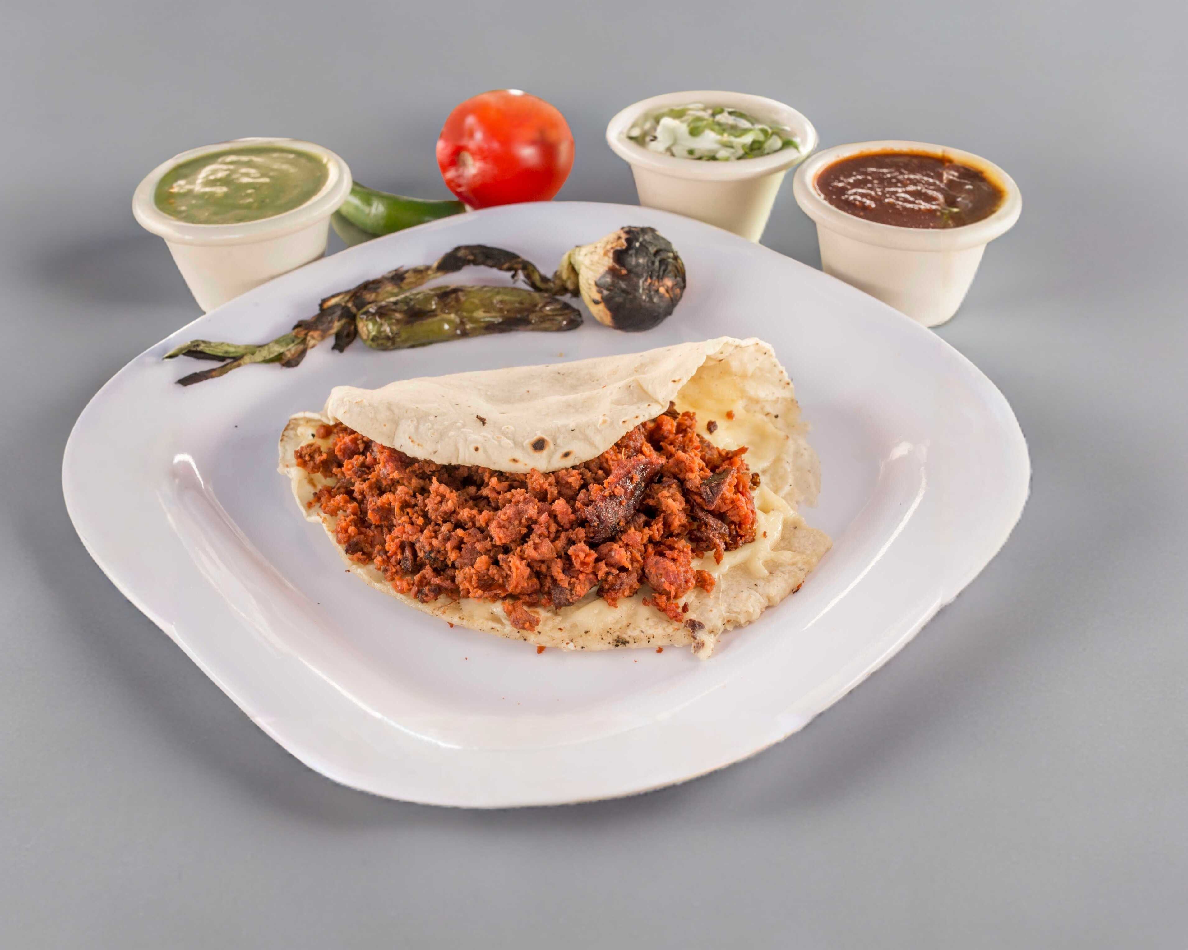 Vampiro (tortilla dorada con queso fundido) con carne a elegir, salsa roja , salsa verde, cebolla y cilantro.