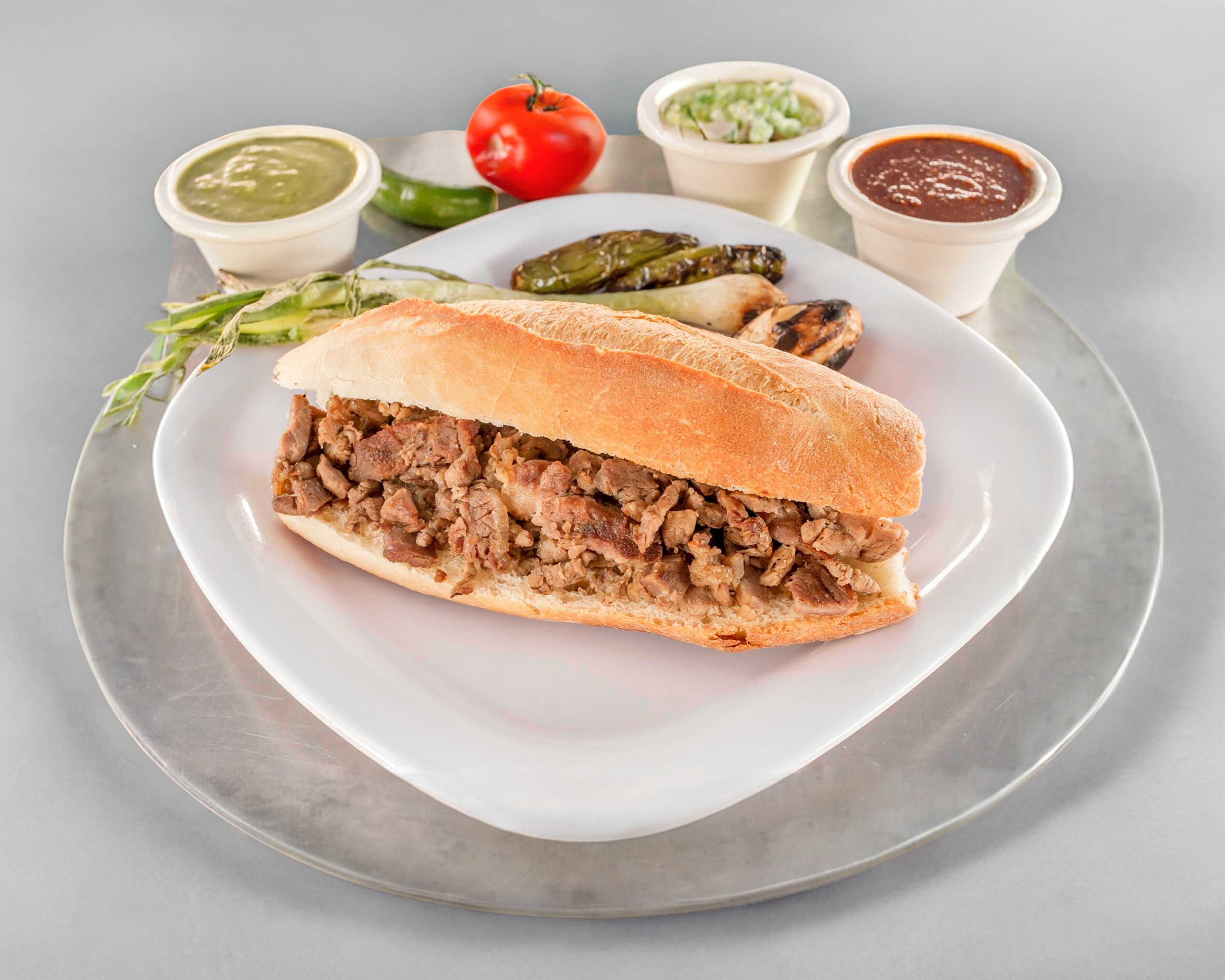 Bolillo con carne a elegir, salsa roja, salsa verde, cebolla y cilantro