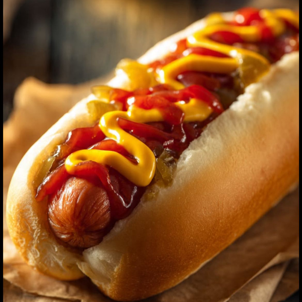 Salchicha, jitomate, cebolla, mostaza, mayonesa, catsup.