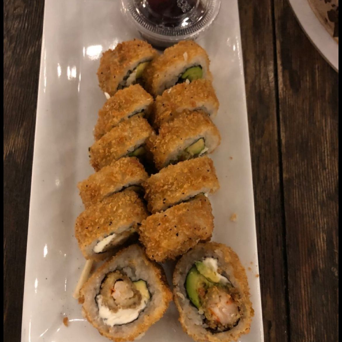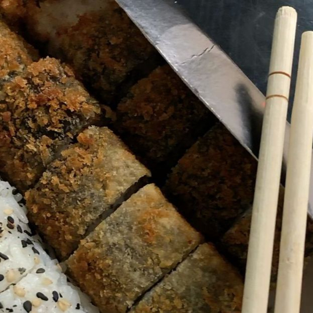 Rollo relleno de pepino, philadelphia, aguacate, camaron, con el alga por fuera y empanizado.