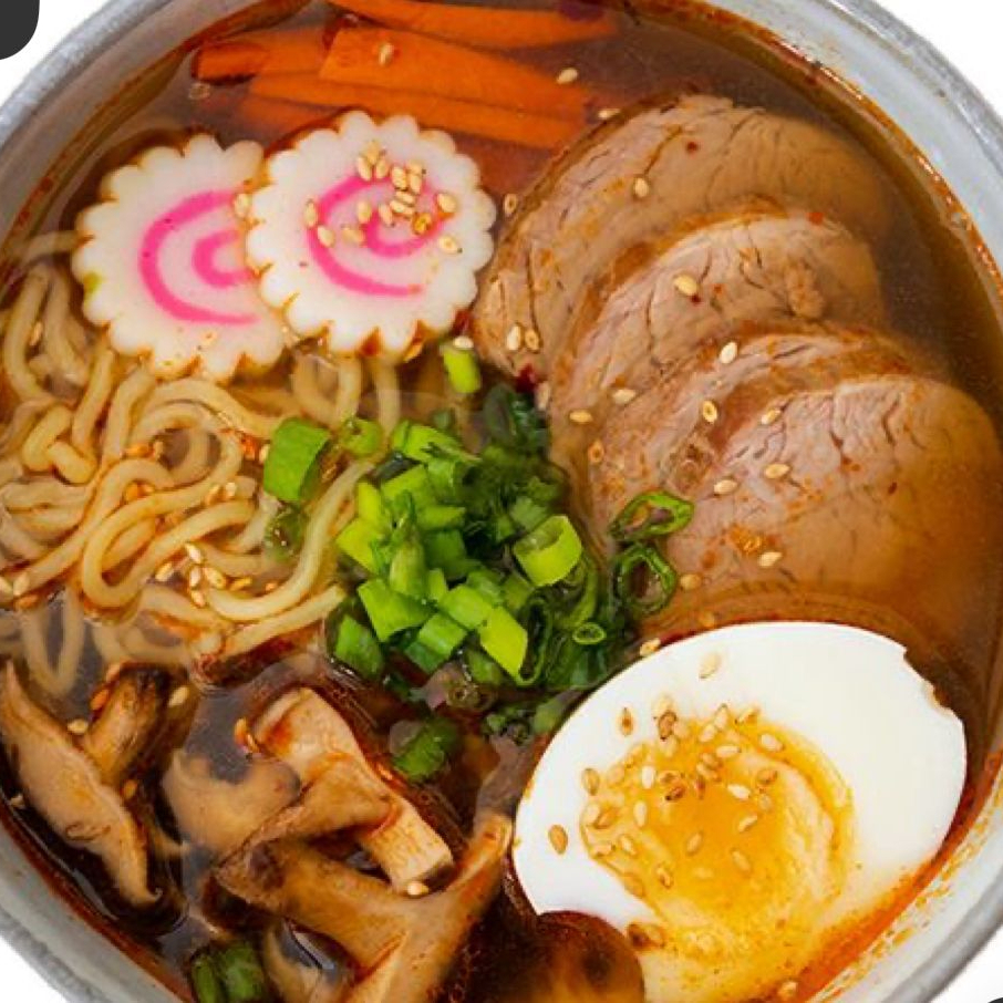 Caldo hecho a base de huesos de pollo y vegetales, toppings: cebollín, elote, champiñón, cebolla morada, ½ huevo, Naruto, bambú, alga y la proteína de su elección.