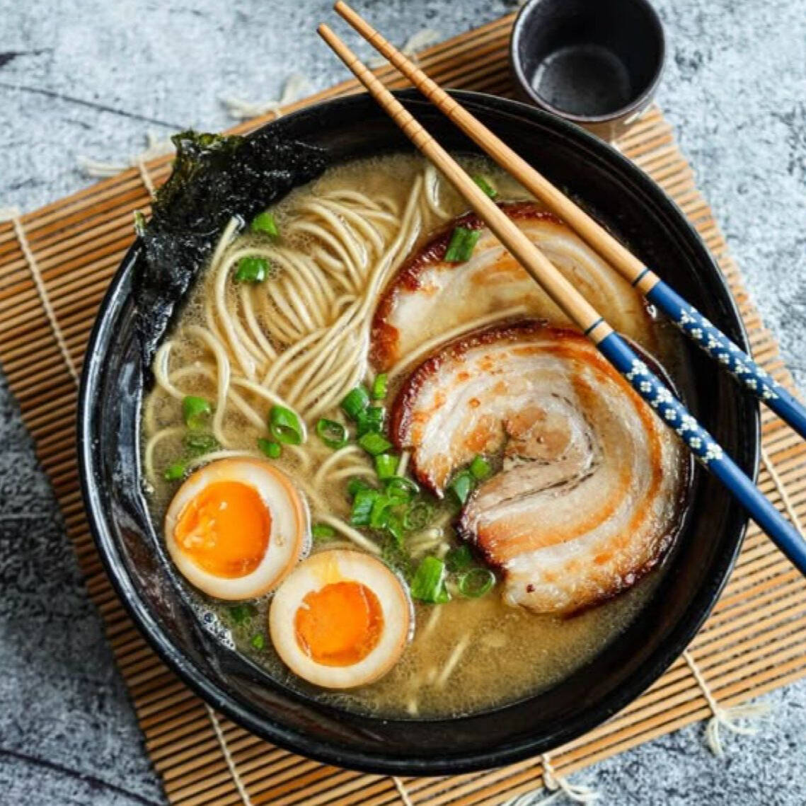 Caldo hecho a base de huesos de cerdo y vegetales, toppings: cebollín, elote, champiñón, cebolla morada, ½ huevo, Naruto, bambú, alga y la proteína de su elección.